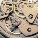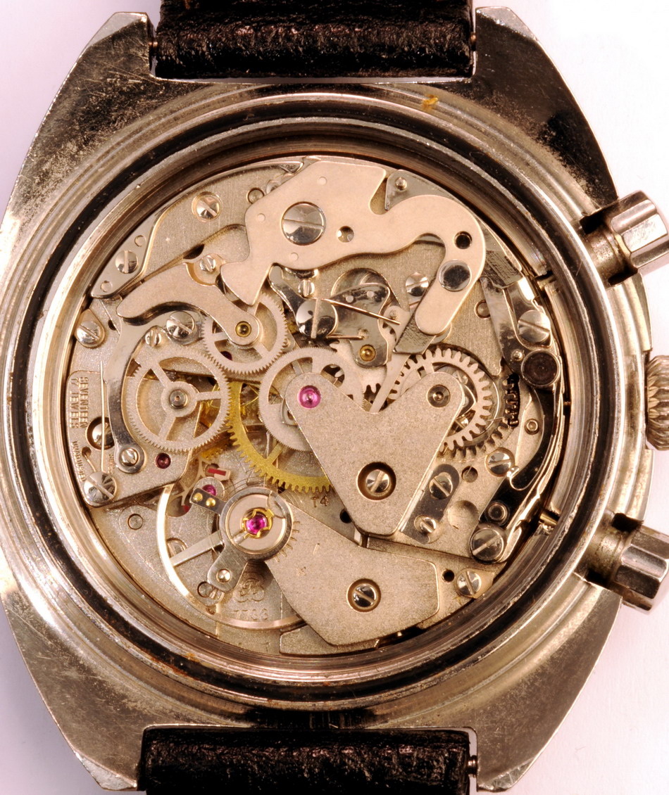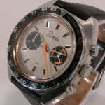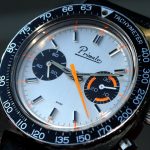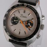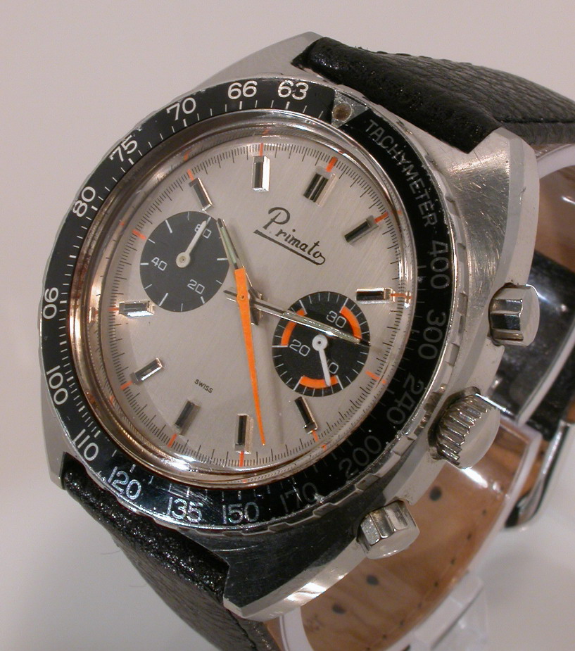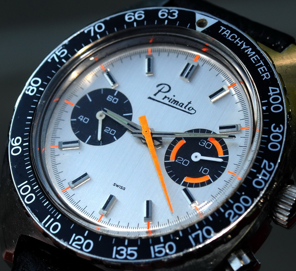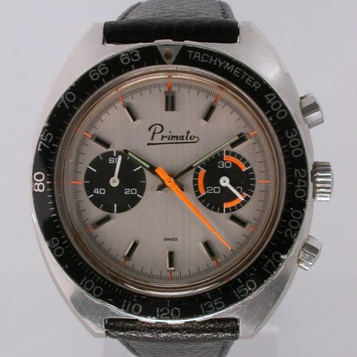 Primato 73363 -- has metallic silver dial with black registers and orange accents; applied markers, with black inserts; polished steel hands, with luminous and black inserts