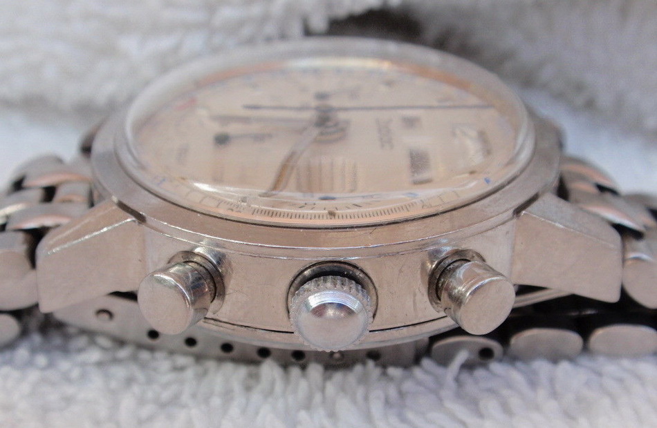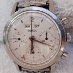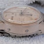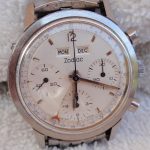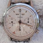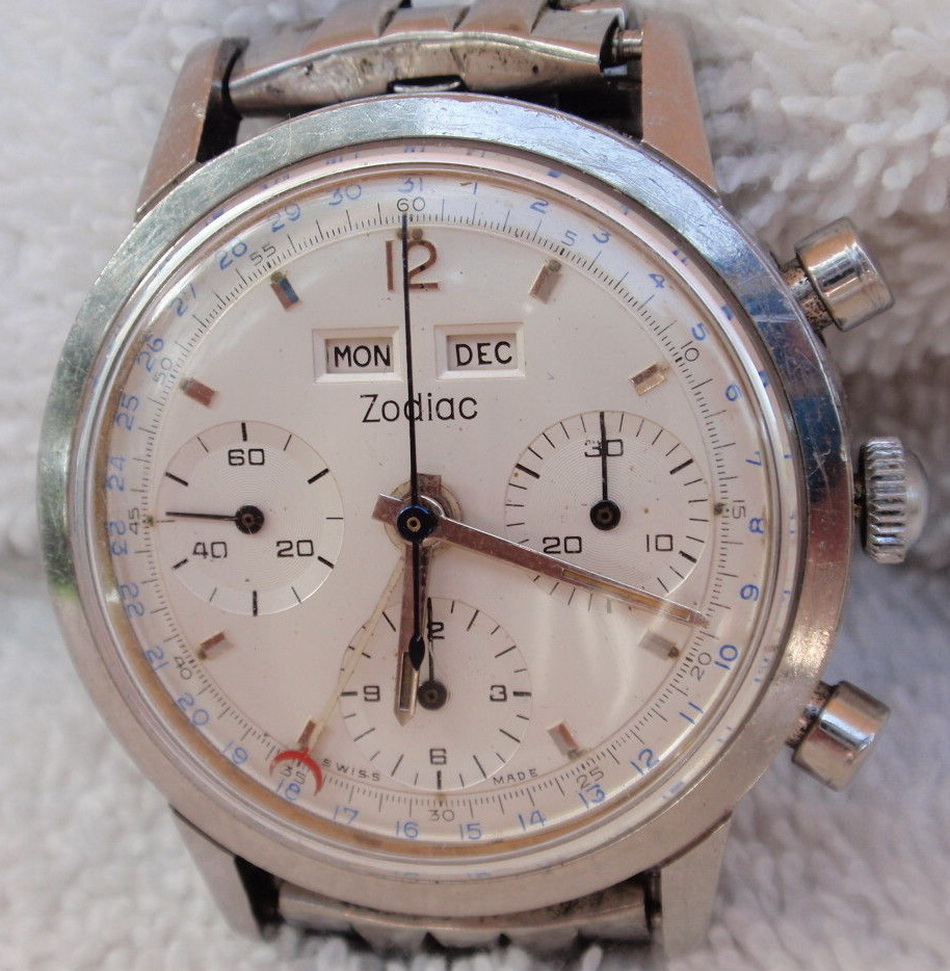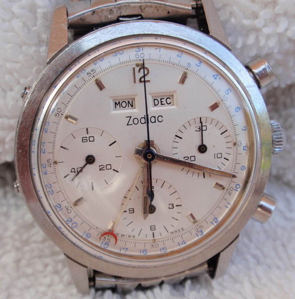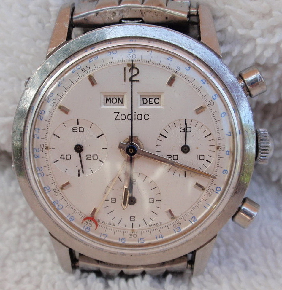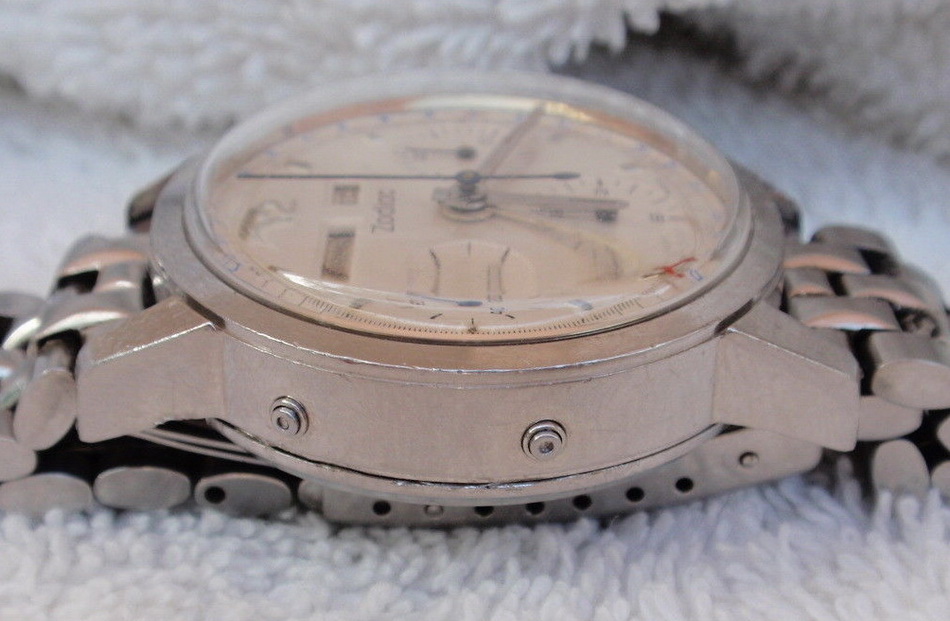 Zodiac Reference 2547 N has narrow lugs; white dial with white registers; monocoque case