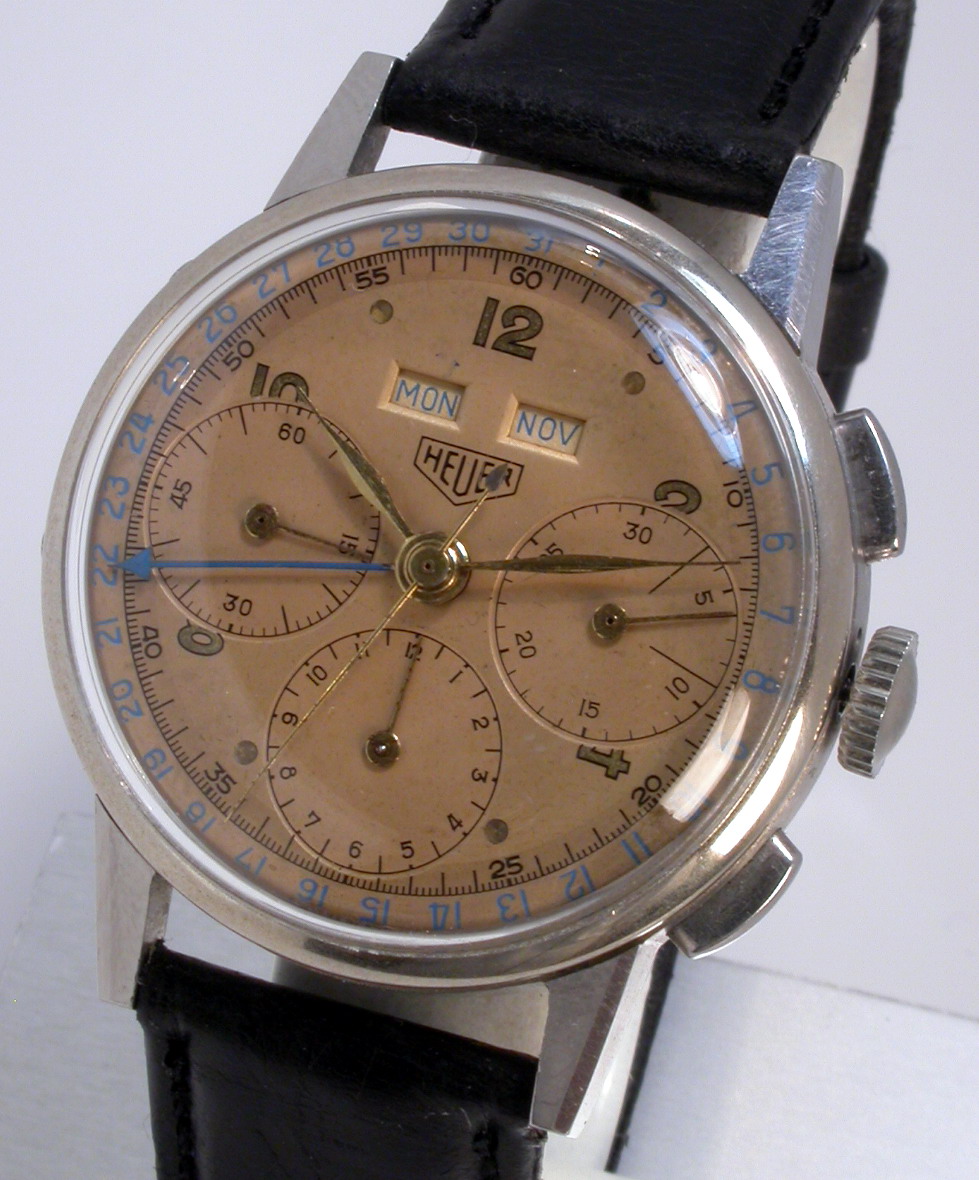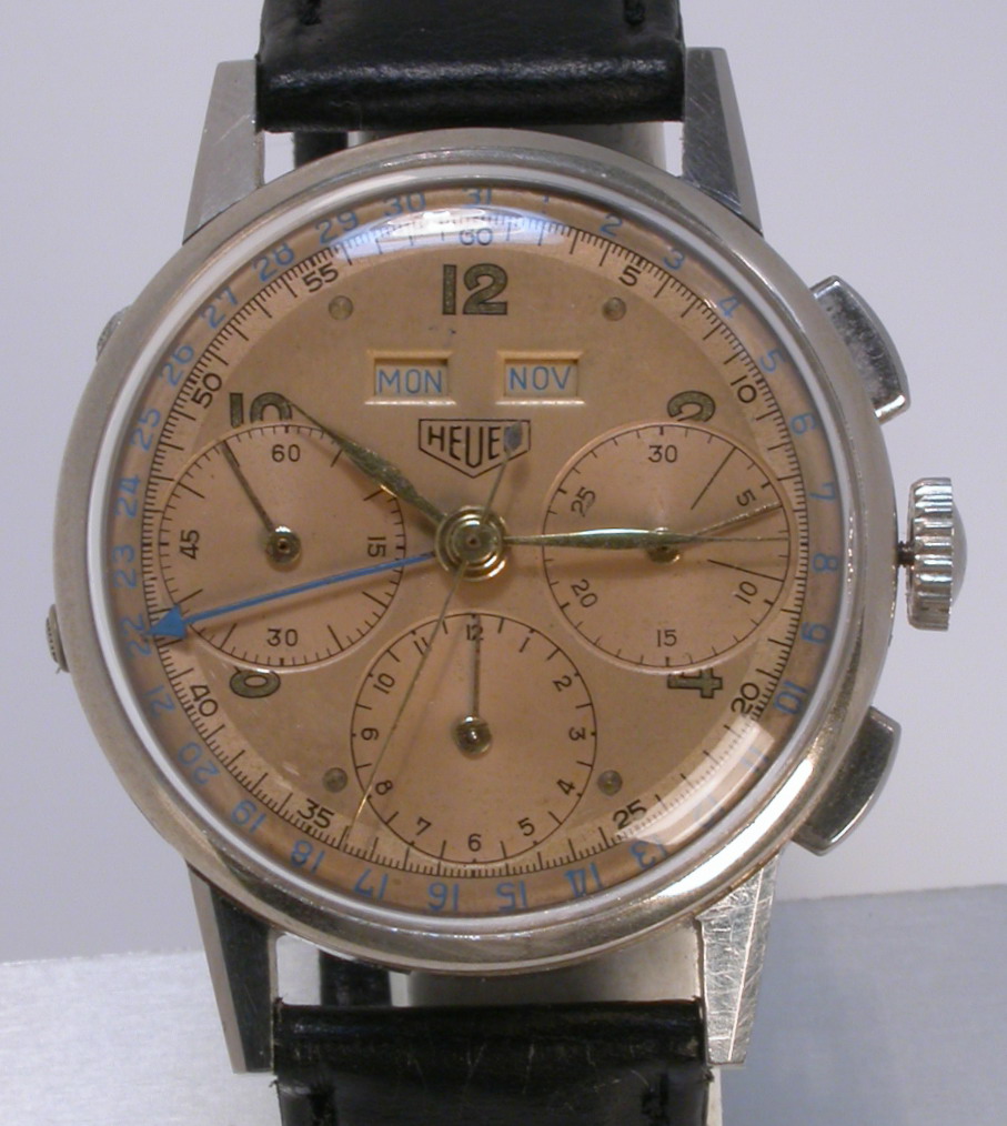 Copper color dial, with blue printing for day, date and month; date hand also painted blue