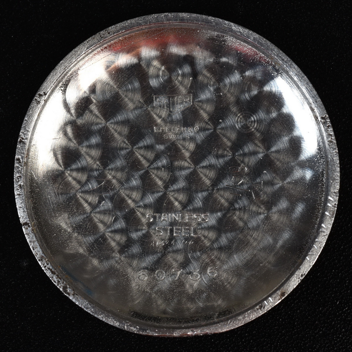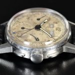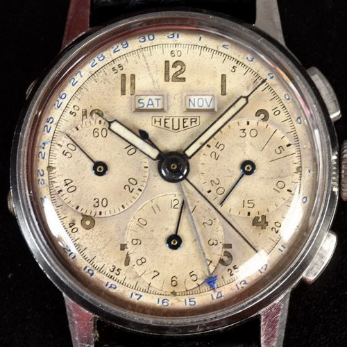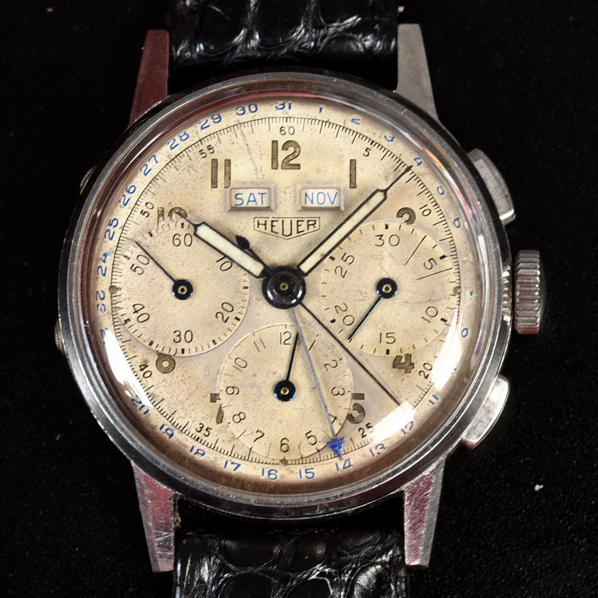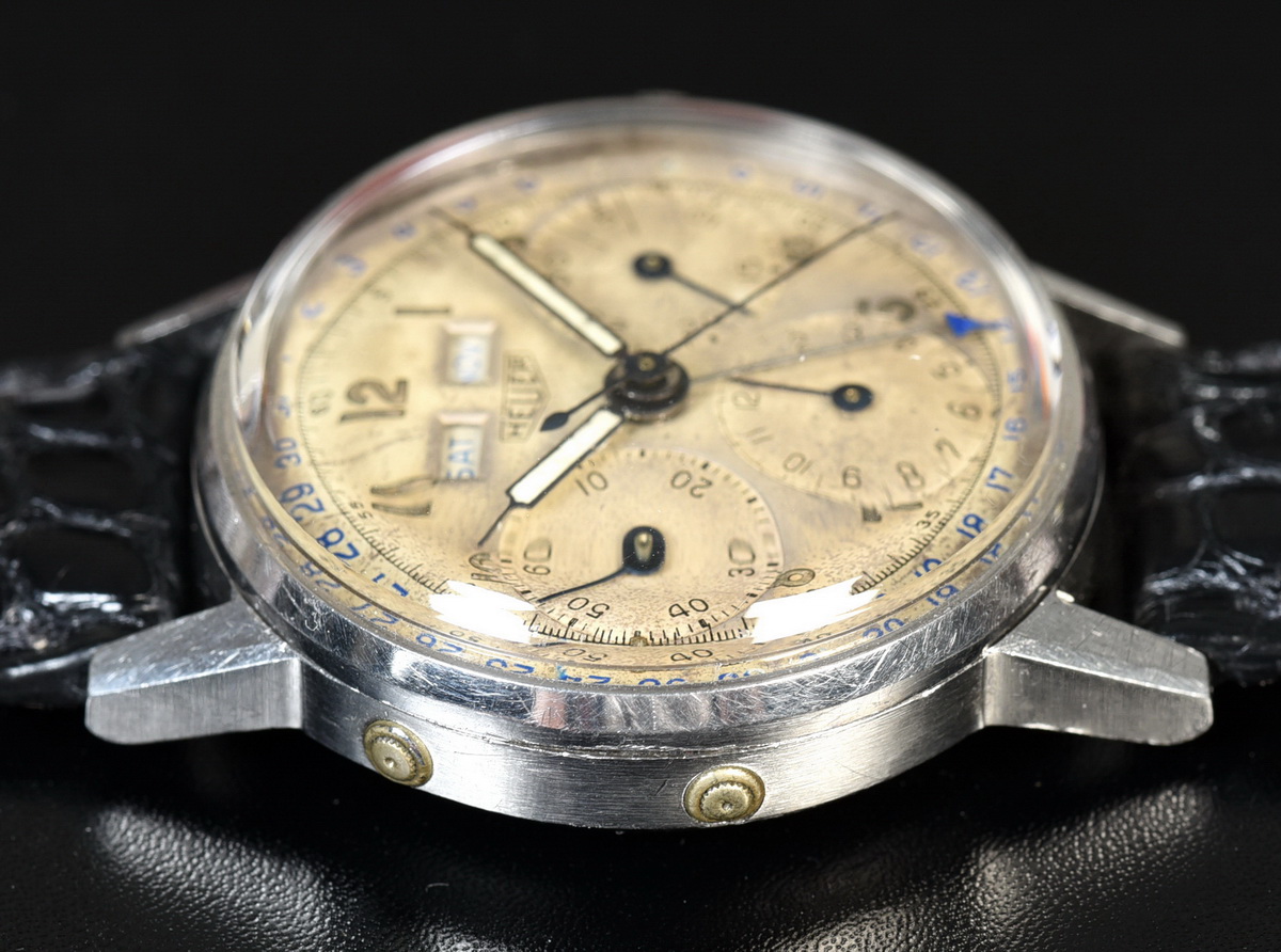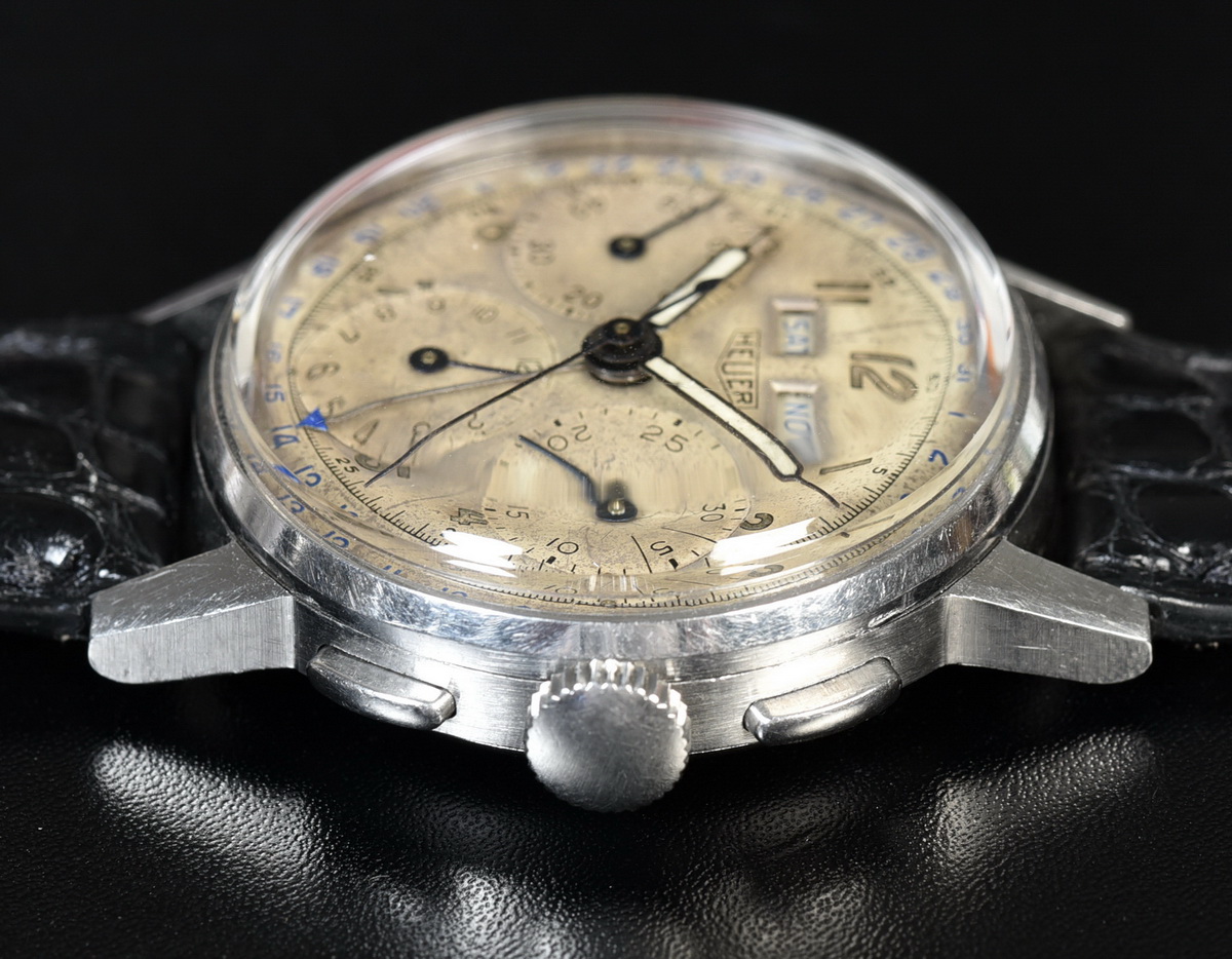 White dial, with blue printing for day, date and month; tip of date hand also painted blue; radium on dial and hands