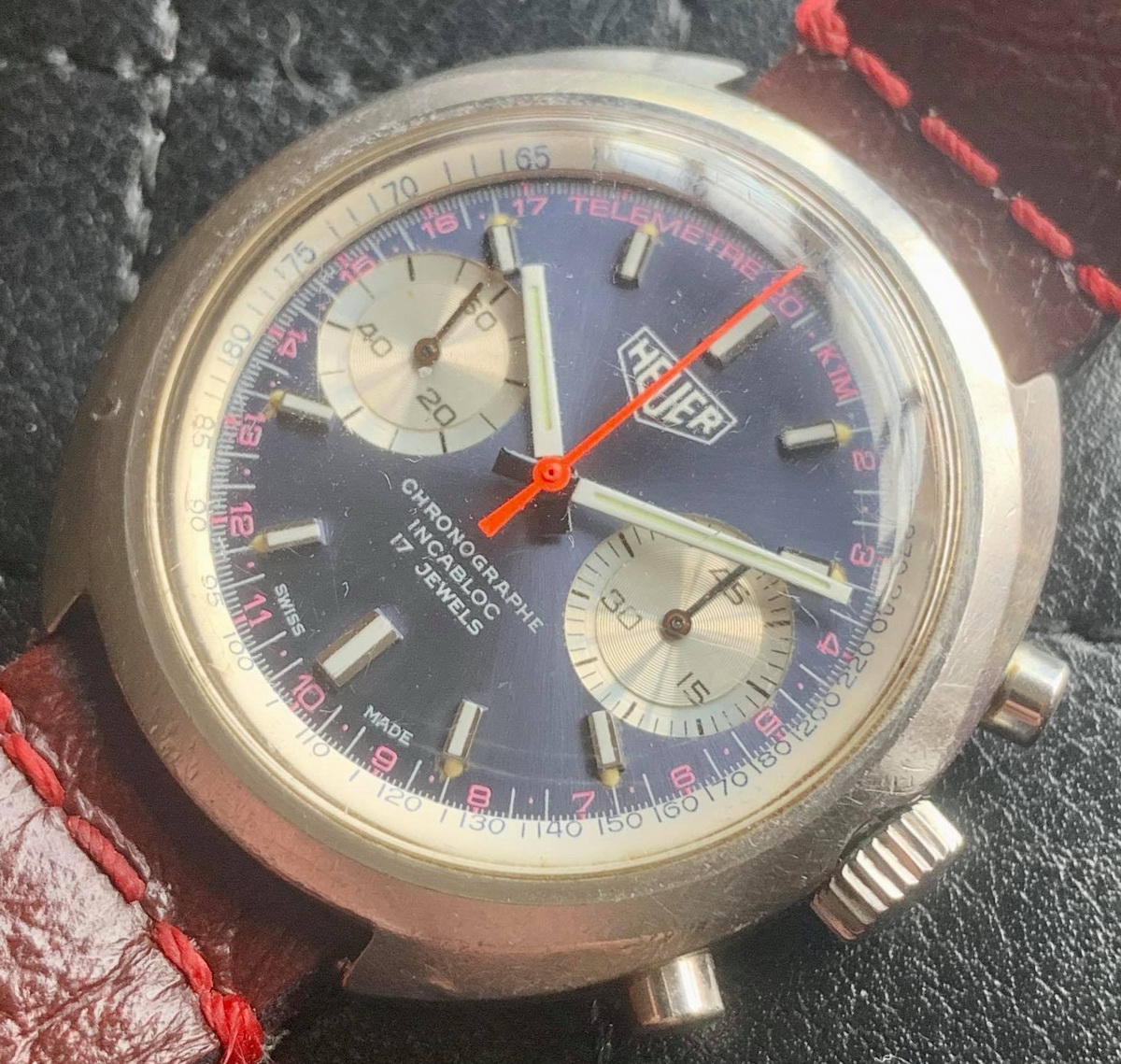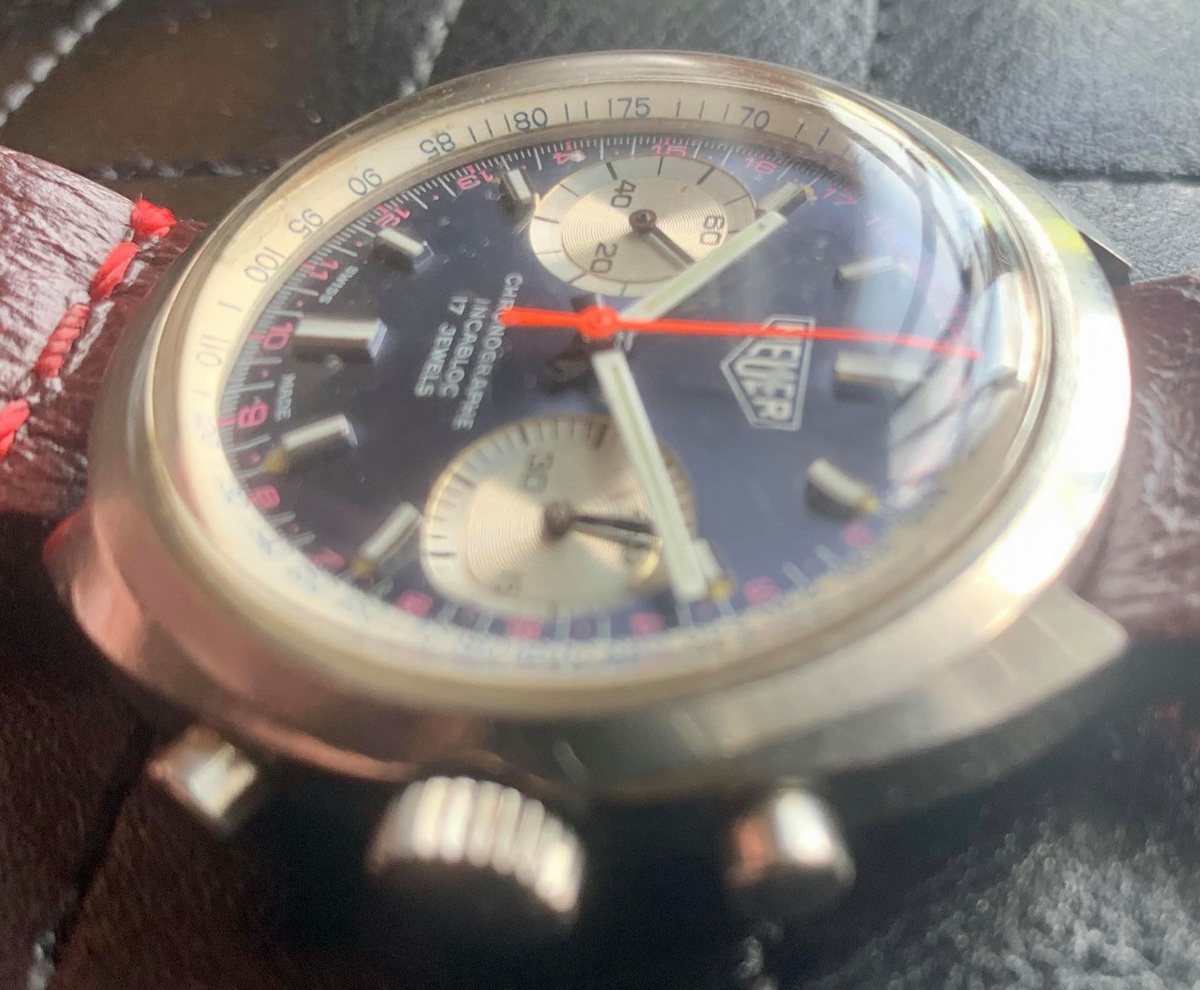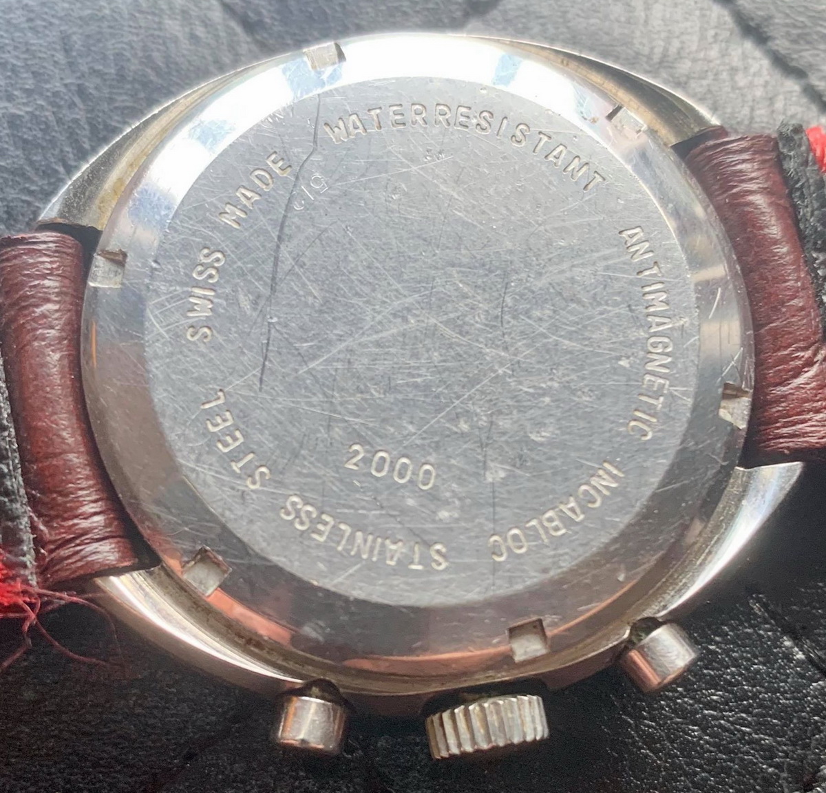 Reference 2000, Blue Dial, has a stainless steel case; dial marked "Chronographe Incabloc 17 Jewels", with two silver registers; powered by the Valjoux 7733 movement.