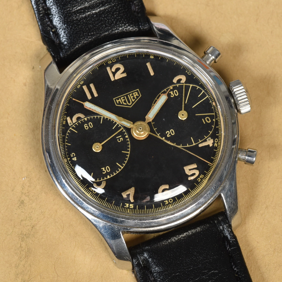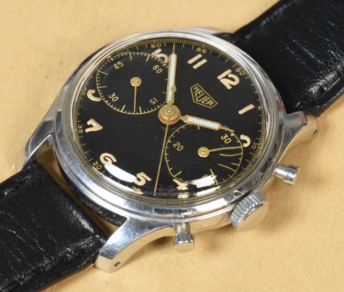 Reference 404 N (Radium) has stainless steel case; black dial with black registers; uses radium for Arabic numerals and hands