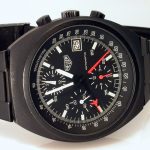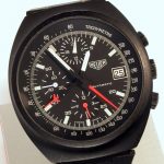 Black-coated case; black dial; white hands; painted luminous markers; separate register for 24 hour indication