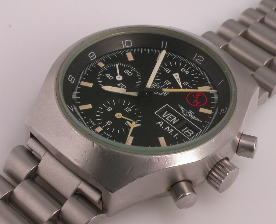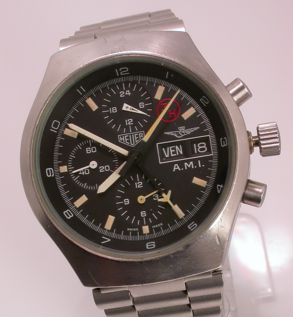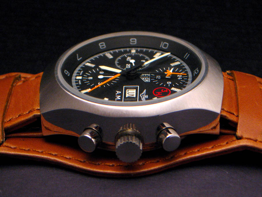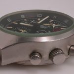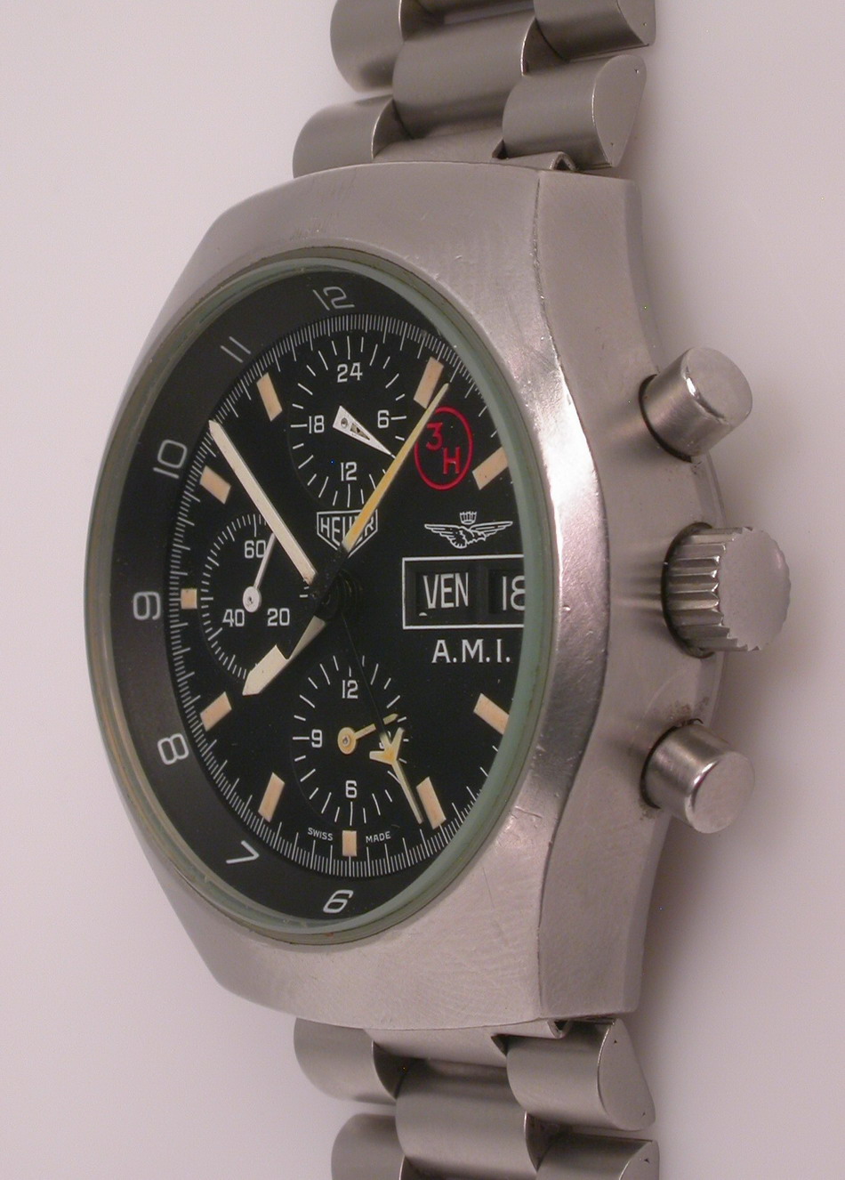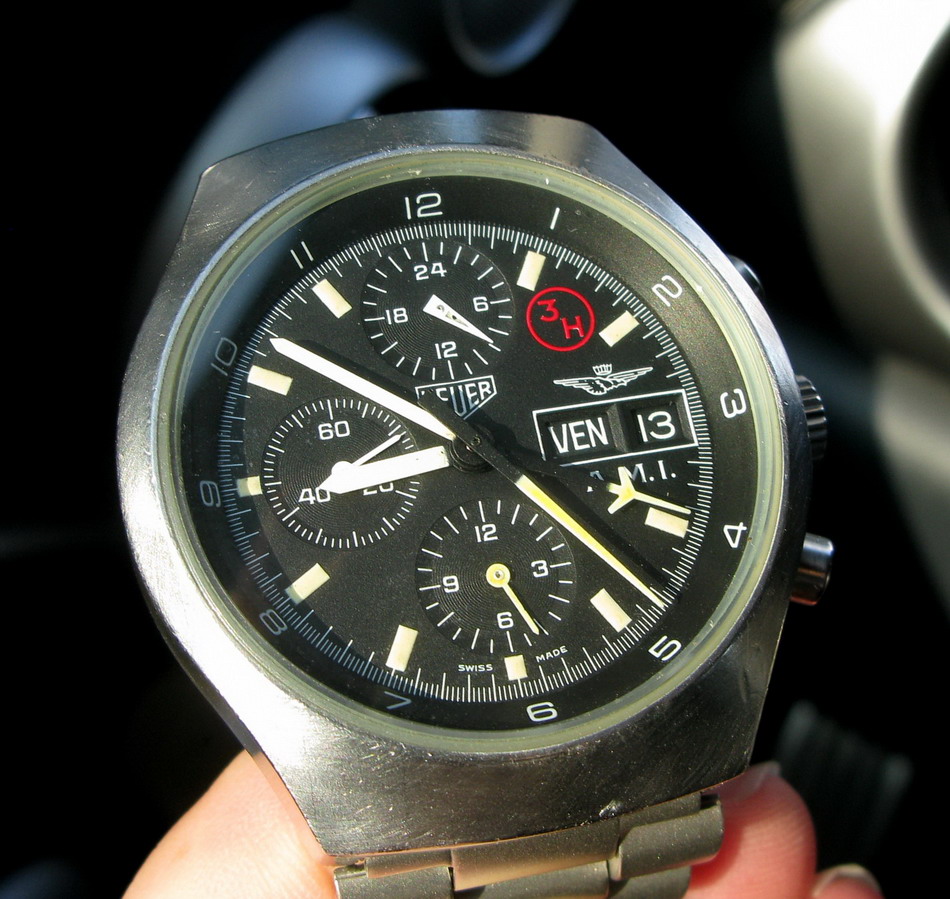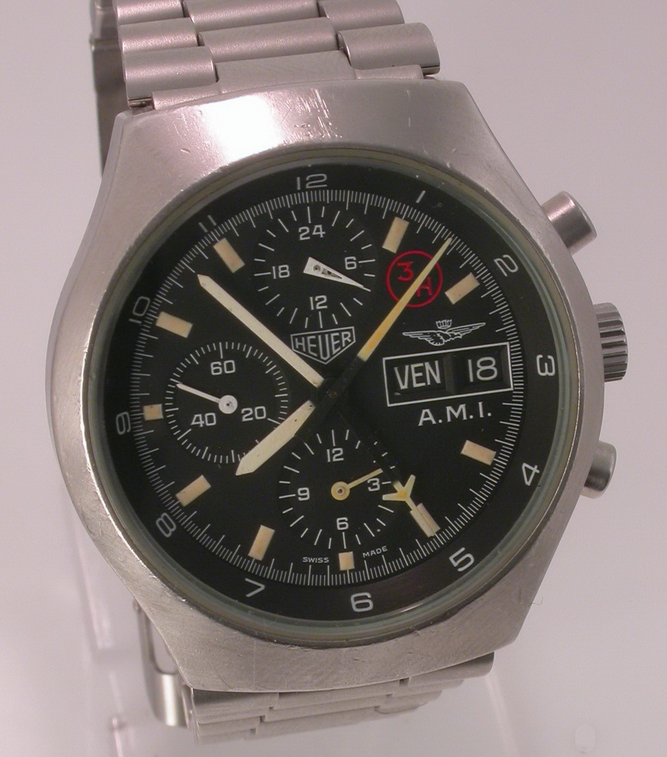 Black dial, with painted luminous markers; inner bezel has numerals for hours