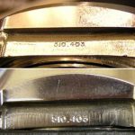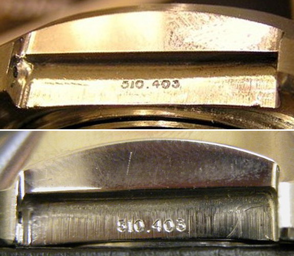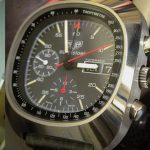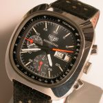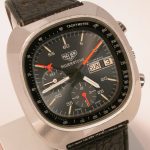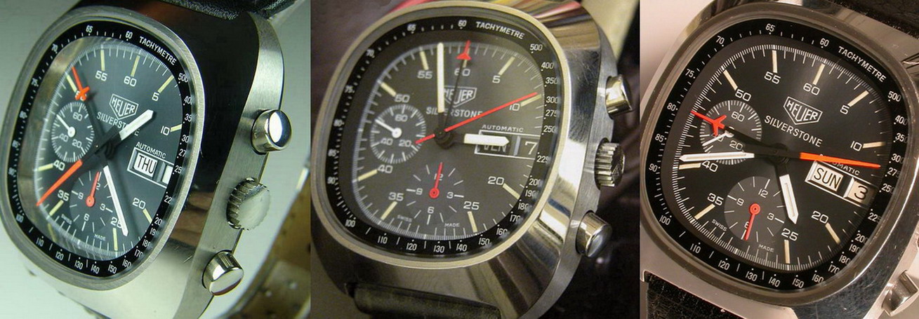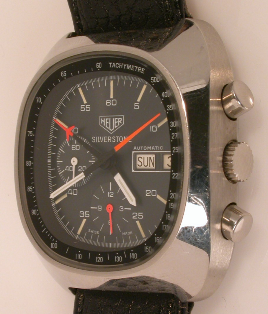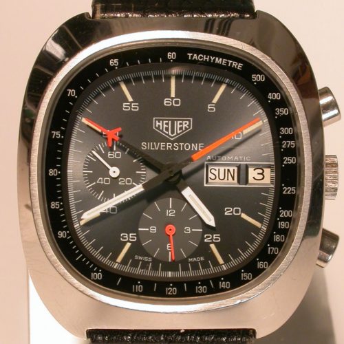 The Lemania 5100 powered Silverstone has a charcoal gray dial, with orange chronograph hands; painted luminous markers and small numerals
