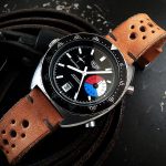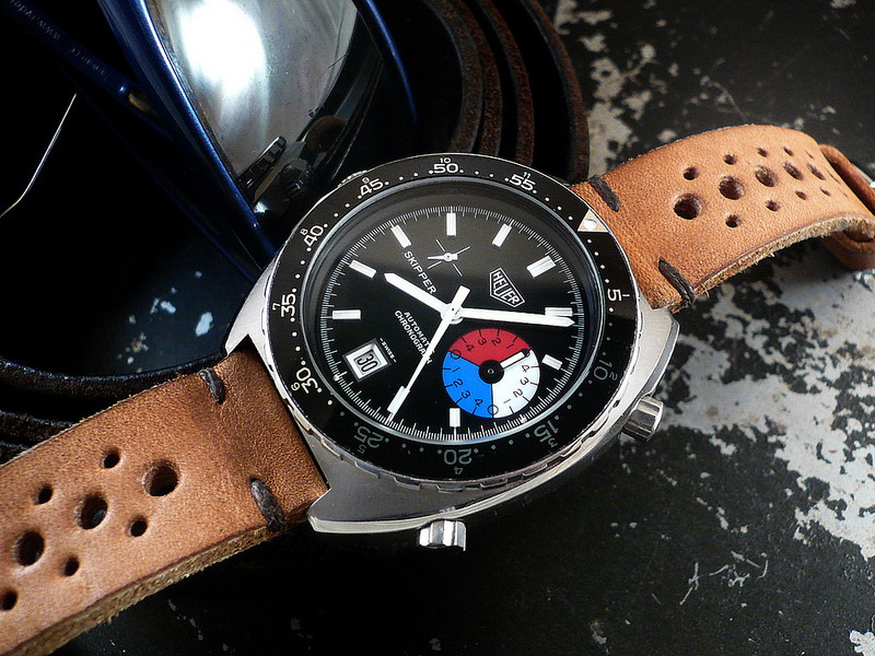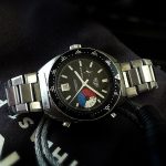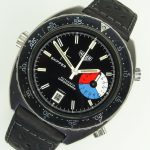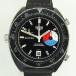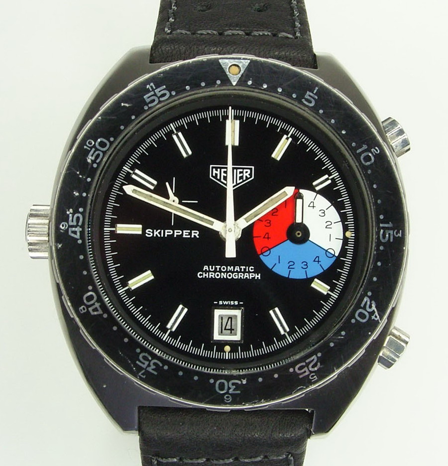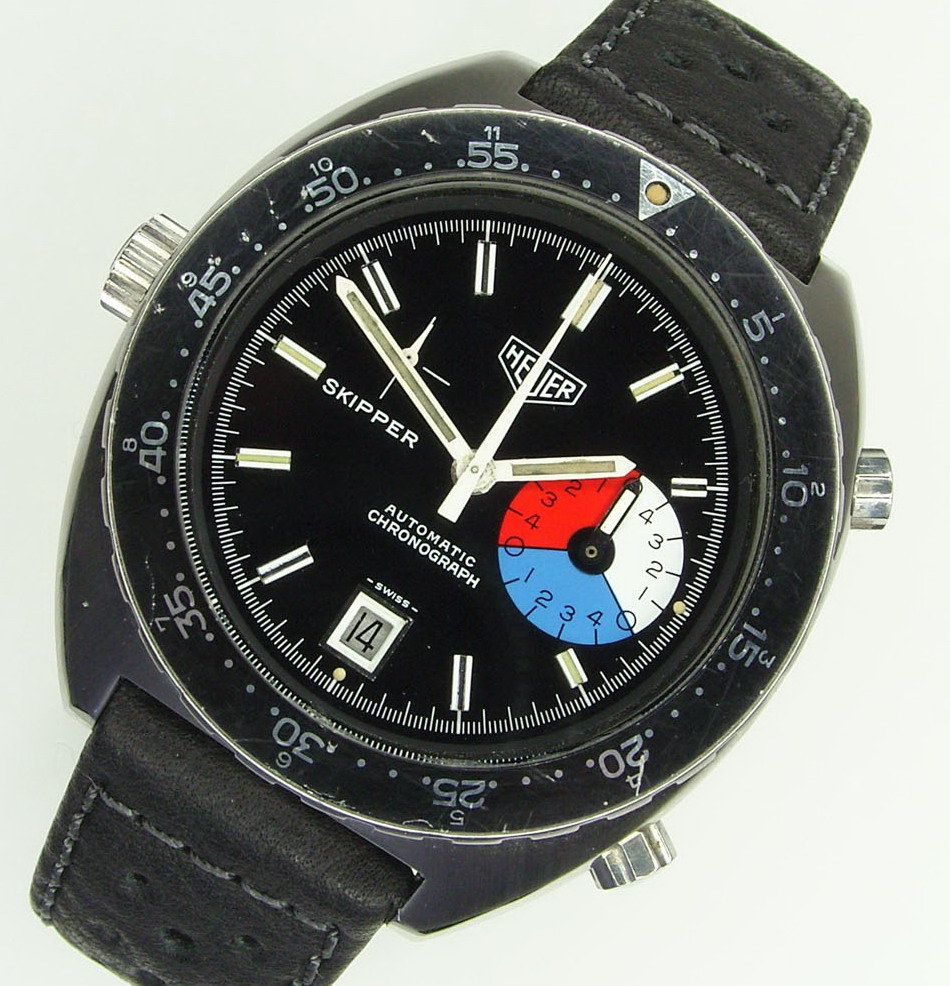 The Skipper Reference 15640 (First Execution) has a black dial; white, blue and red on minute recorder; white hands; black rotating MH bezel; automatic winding