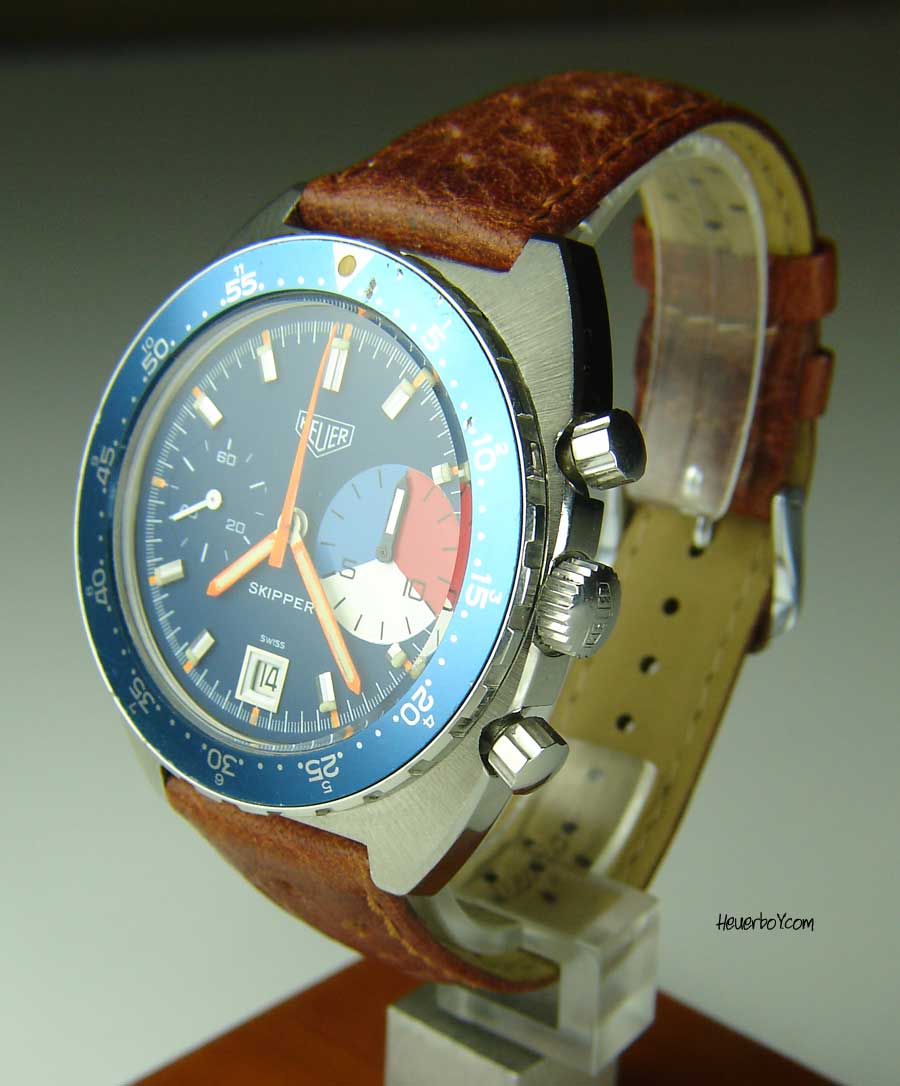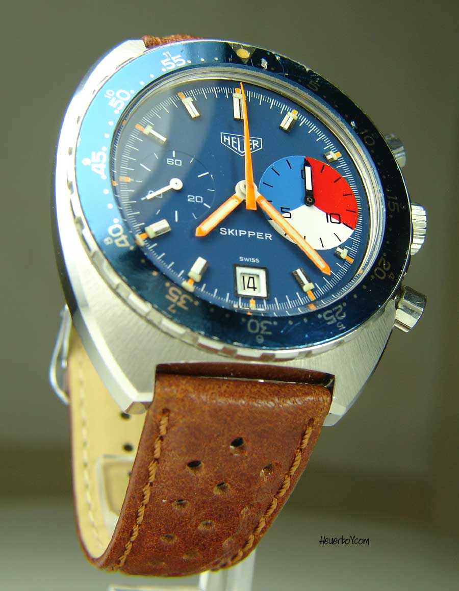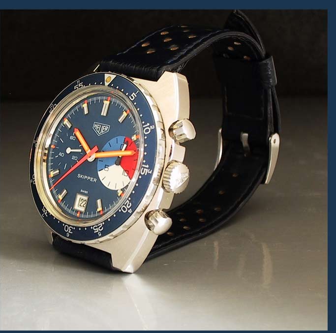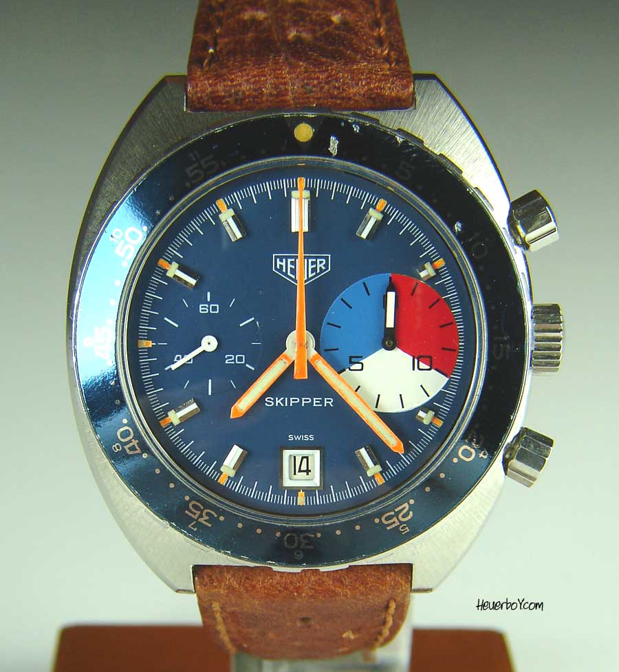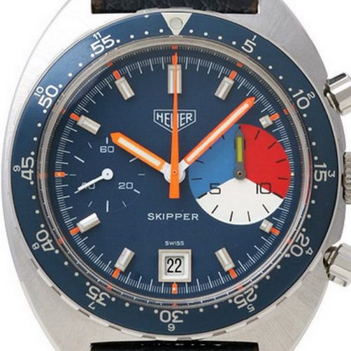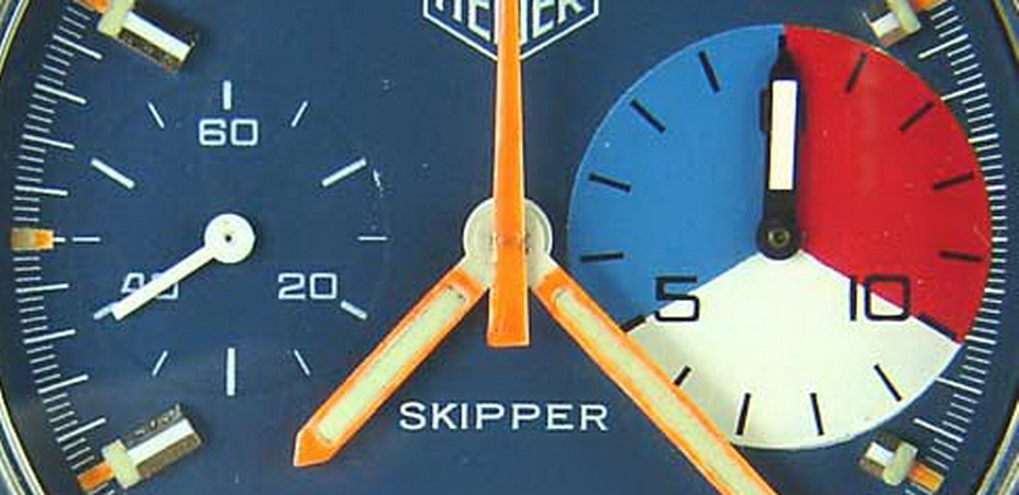 The Skipper Reference 73464 (First Execution) uses an Autavia screw-back case (Reference 73463); has a blue dial; red, white and blue on segments on minute recorder; blue rotating MH bezel; manual winding