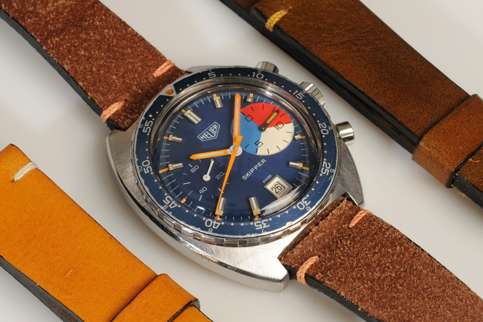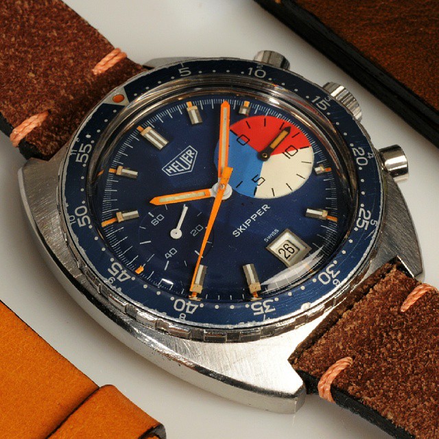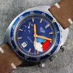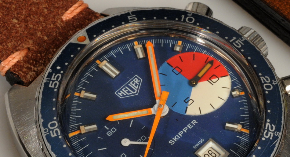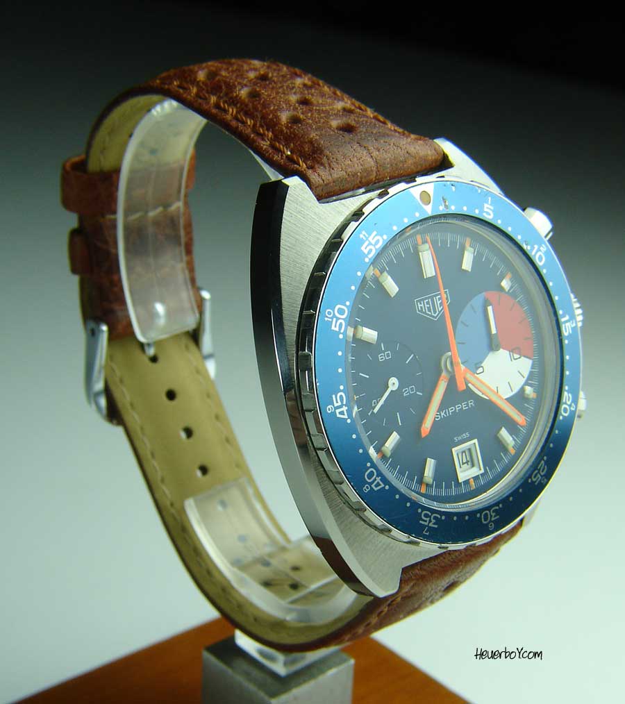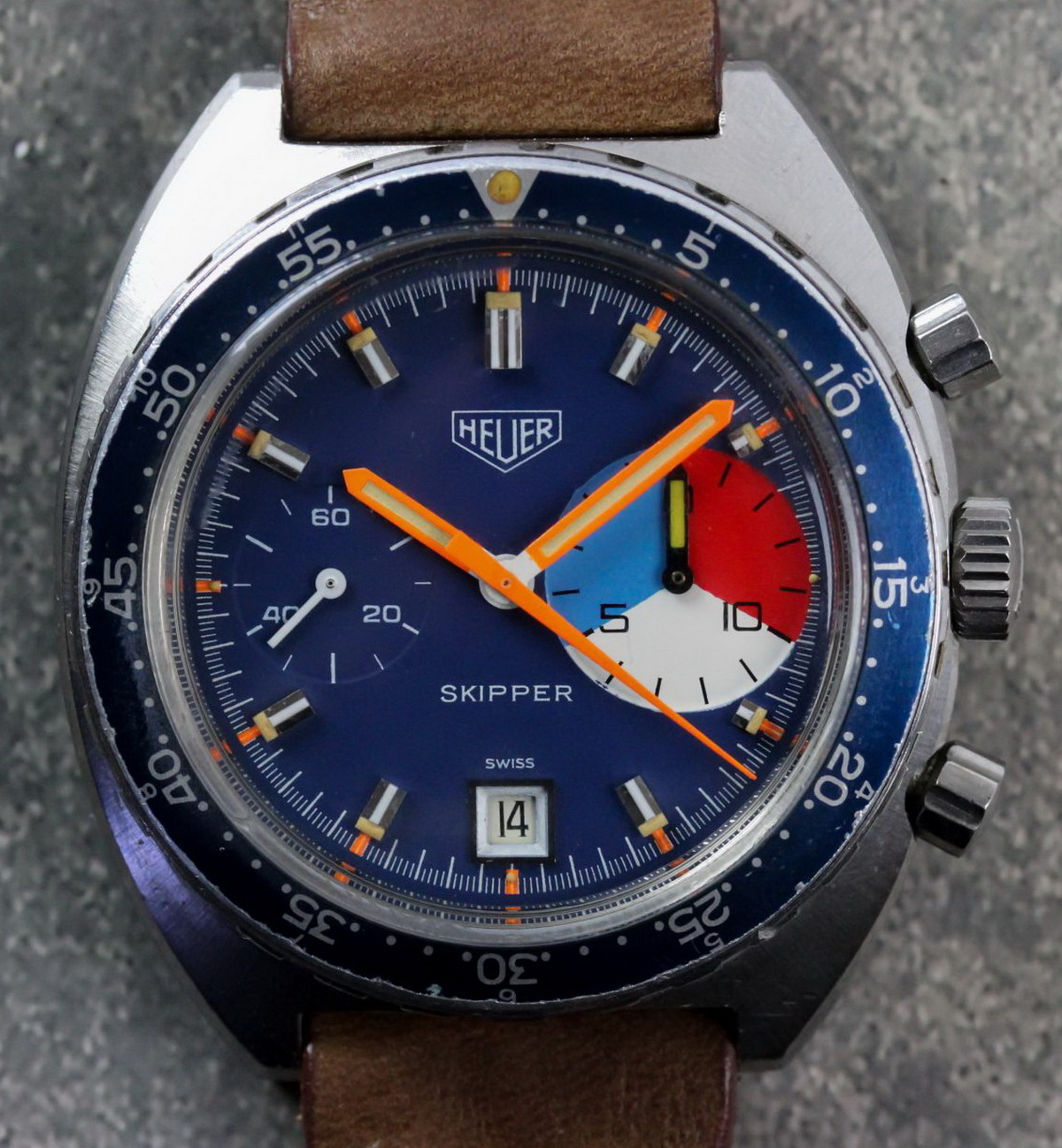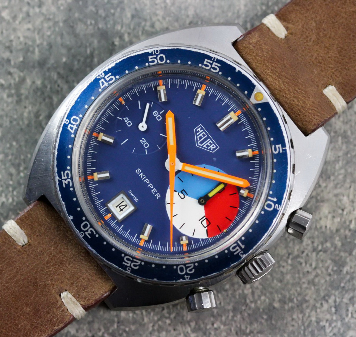 The Skipper Reference 73464 (First Execution) uses an Autavia screw-back case (Reference 73463); has a blue dial; red, white and blue on segments on minute recorder; blue rotating MH bezel; manual winding