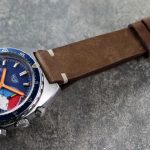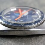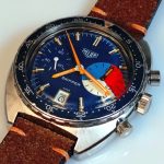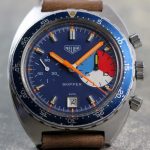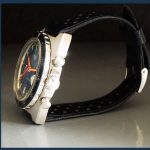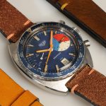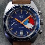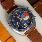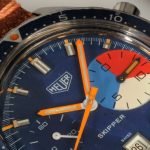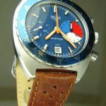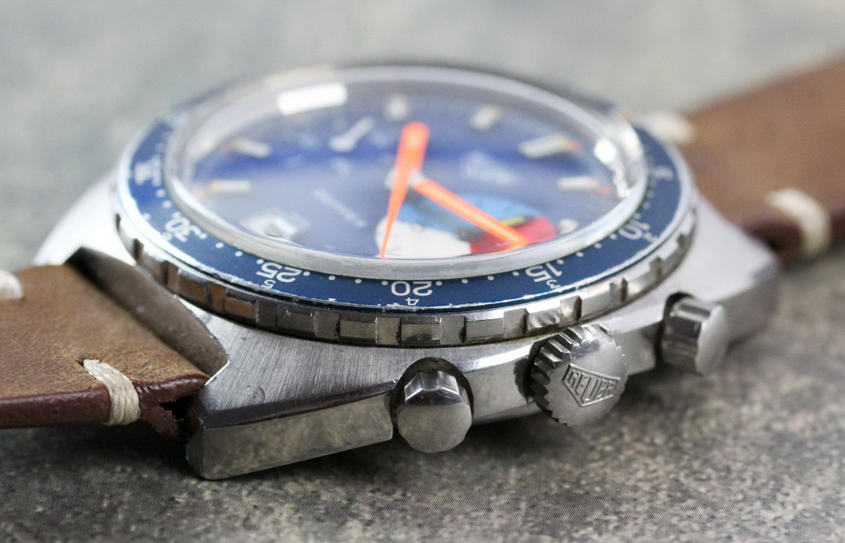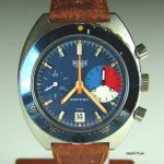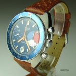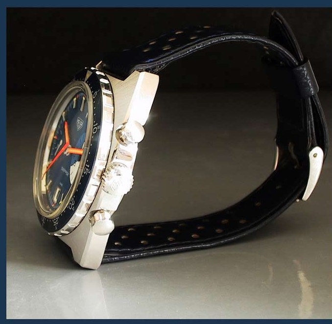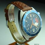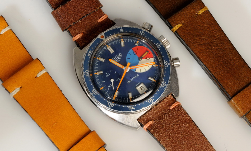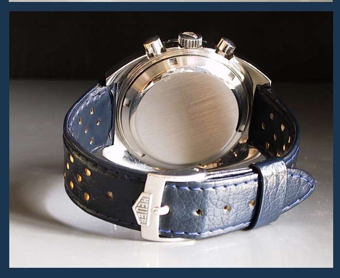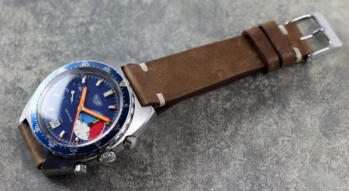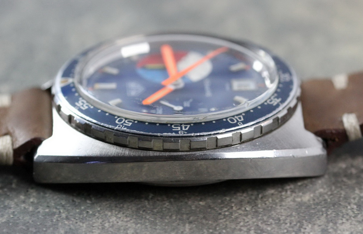 The Skipper Reference 73464 (First Execution) uses an Autavia screw-back case (Reference 73463); has a blue dial; red, white and blue on segments on minute recorder; blue rotating MH bezel; manual winding