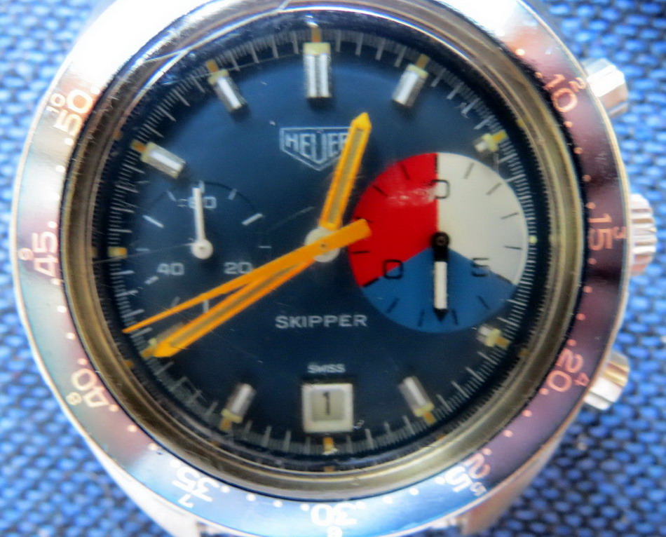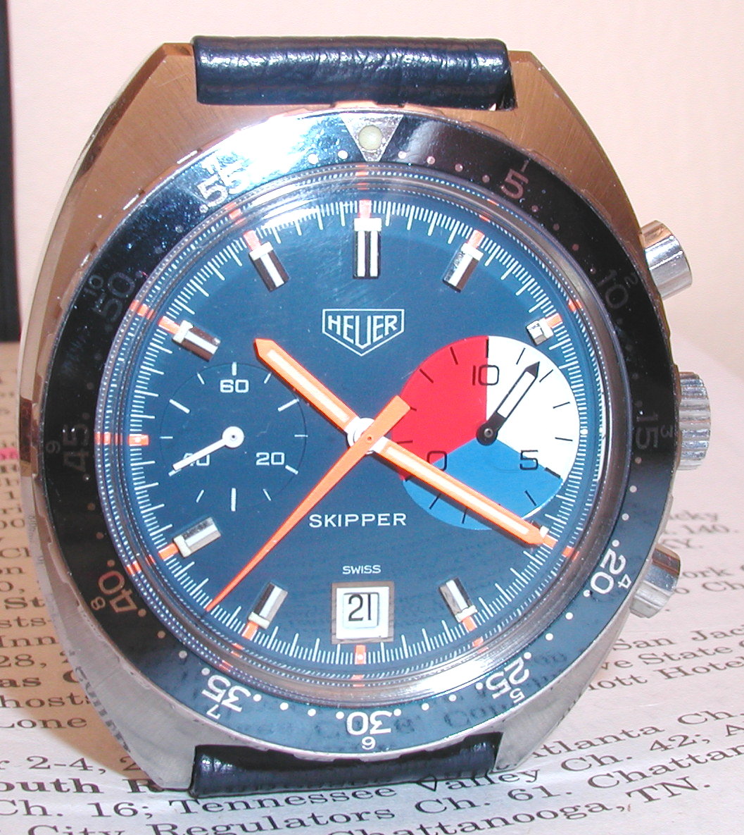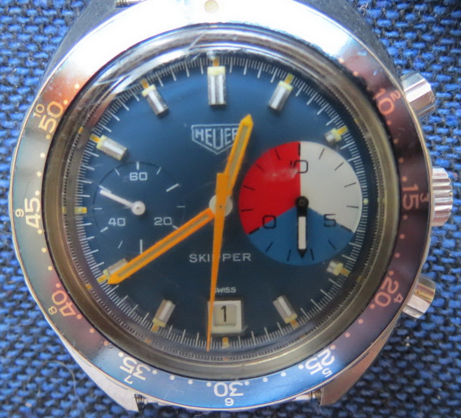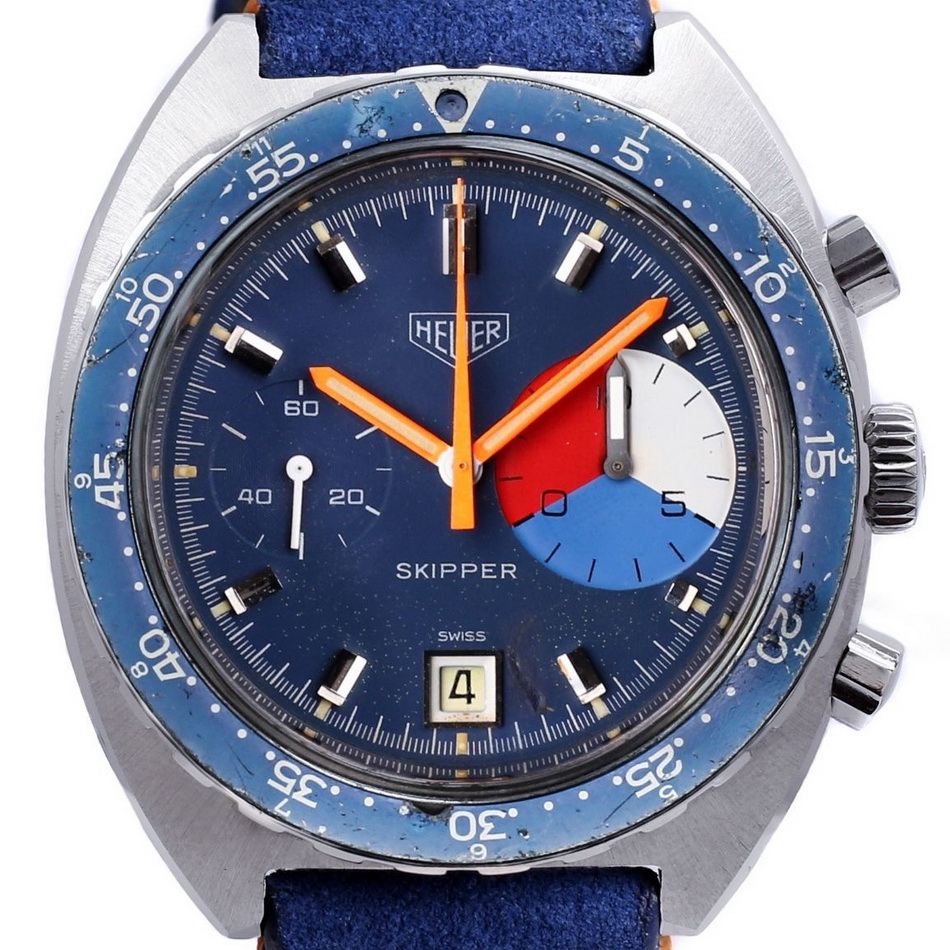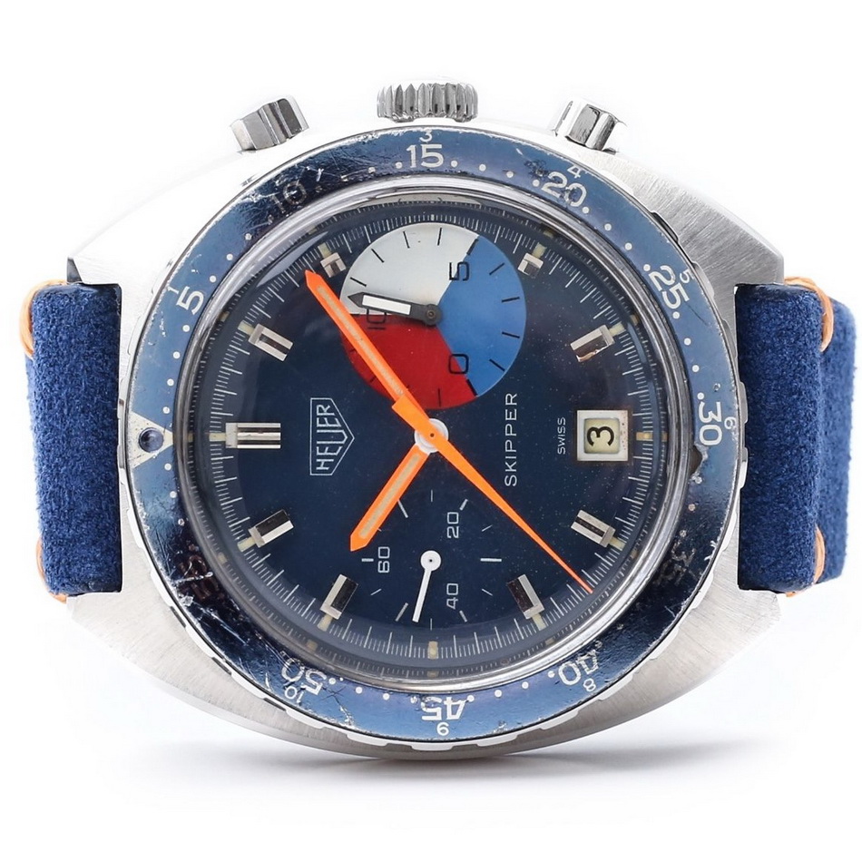 The Skipper Reference 73464 (Second Execution) uses an Autavia screw-back case (Reference 73463); has a blue dial; white, blue and red segments on minute recorder; blue rotating MH bezel; manual winding