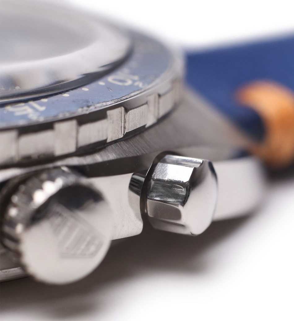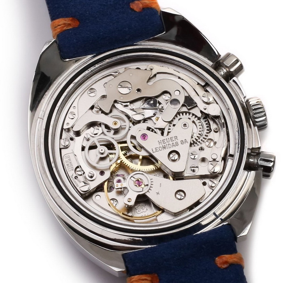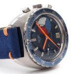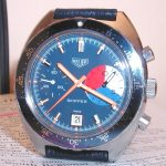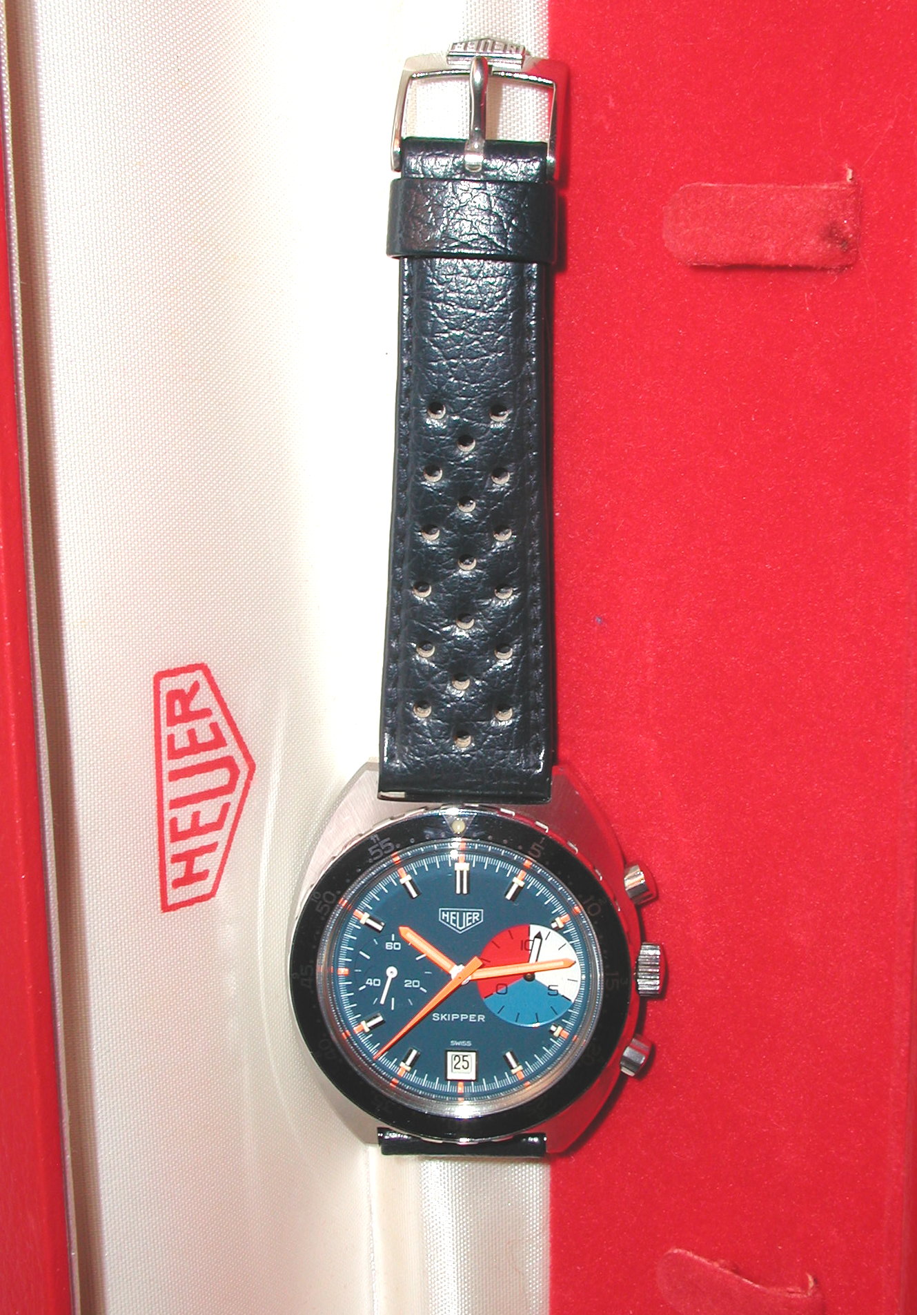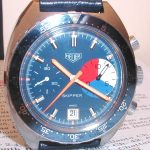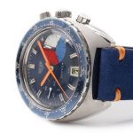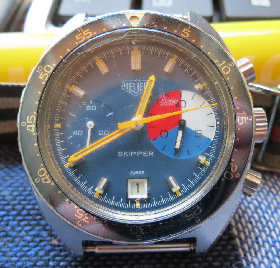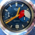 The Skipper Reference 73464 (Second Execution) uses an Autavia screw-back case (Reference 73463); has a blue dial; white, blue and red segments on minute recorder; blue rotating MH bezel; manual winding