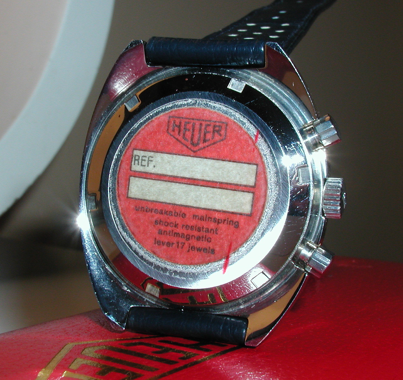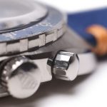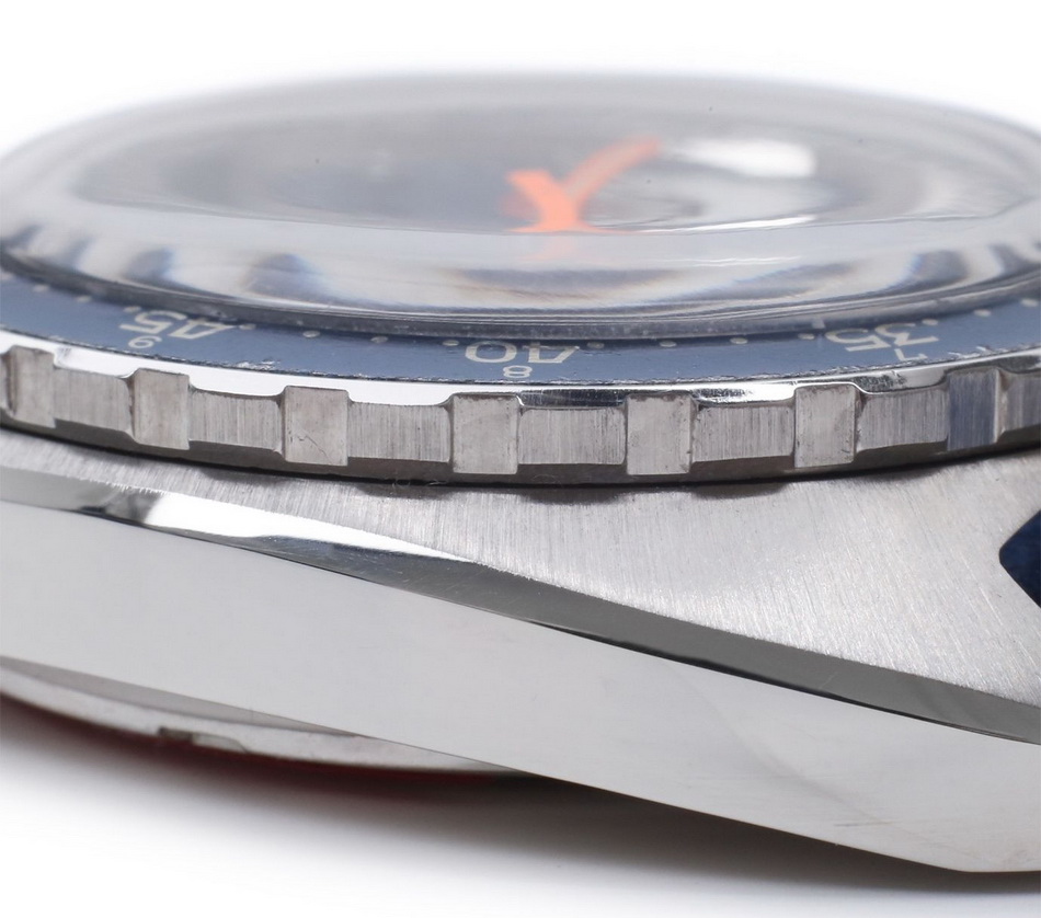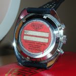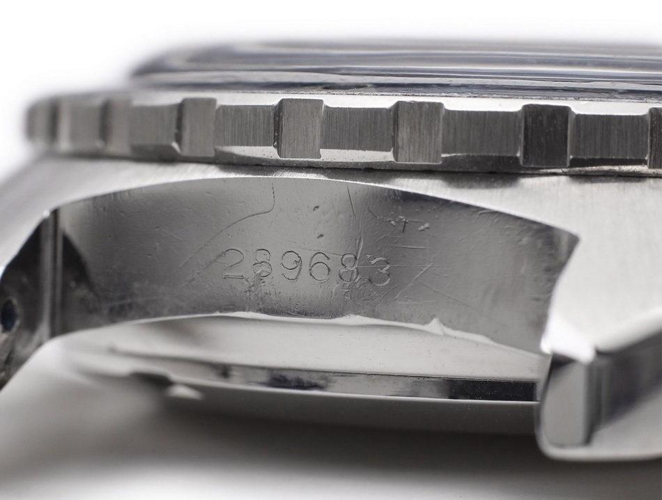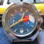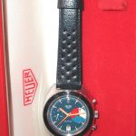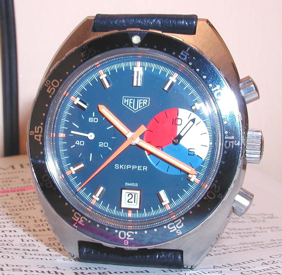 The Skipper Reference 73464 (Second Execution) uses an Autavia screw-back case (Reference 73463); has a blue dial; white, blue and red segments on minute recorder; blue rotating MH bezel; manual winding