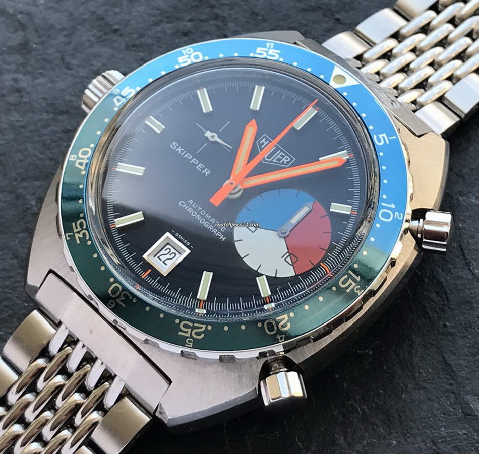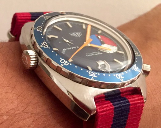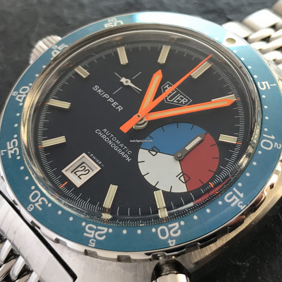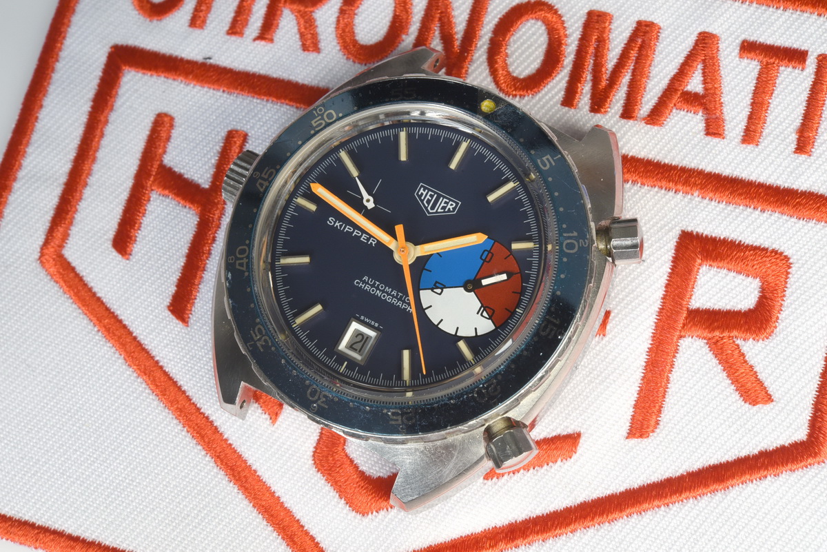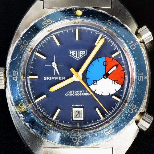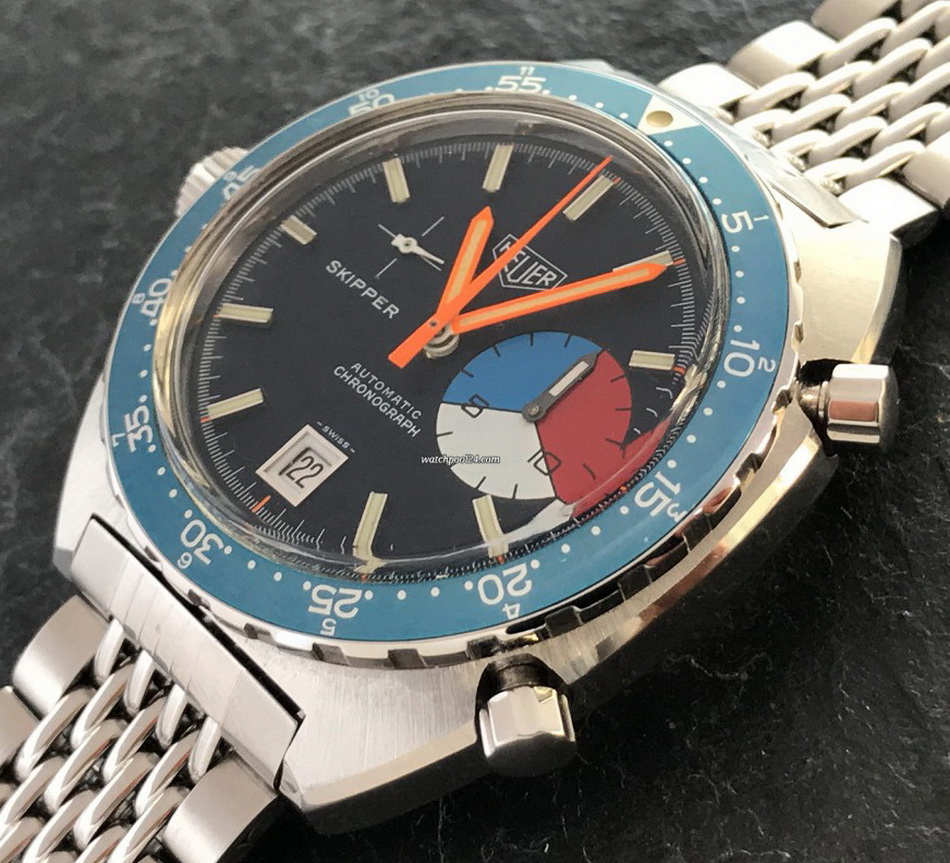 The Skipper Reference 1564 uses an Autavia screw-back case; has a blue dial; red, white and blue segments on minute recorder; orange hands with full luminous inserts; blue rotating MH bezel; automatic winding
