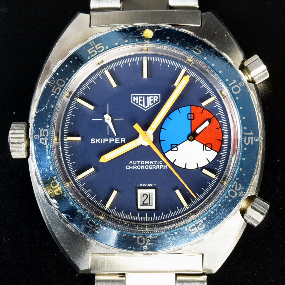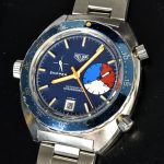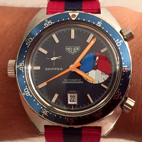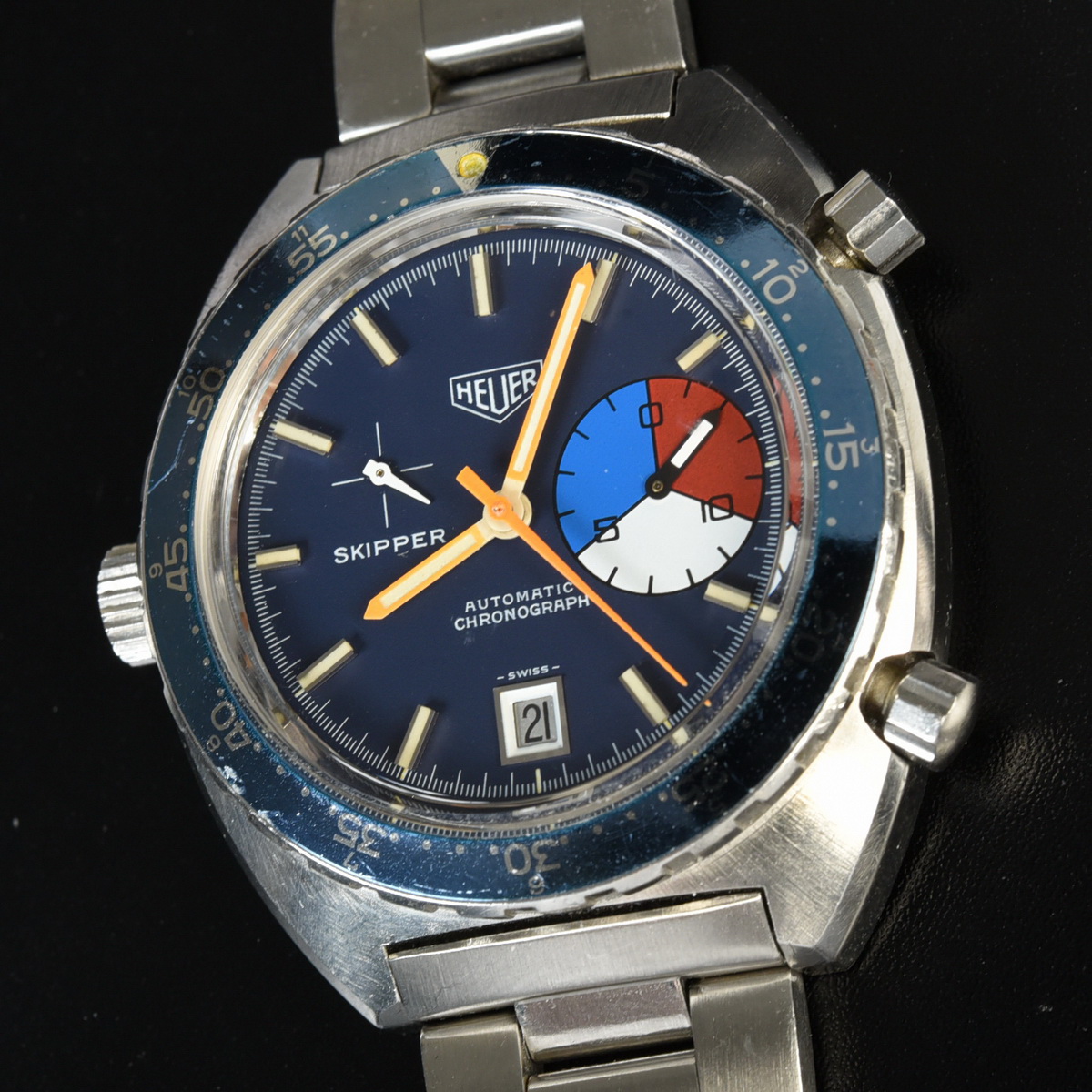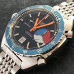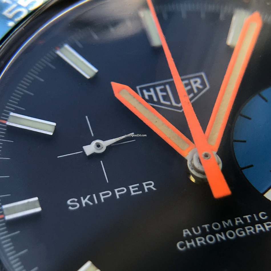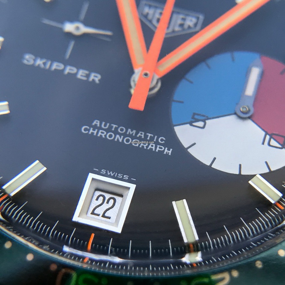 The Skipper Reference 1564 uses an Autavia screw-back case; has a blue dial; red, white and blue segments on minute recorder; orange hands with full luminous inserts; blue rotating MH bezel; automatic winding