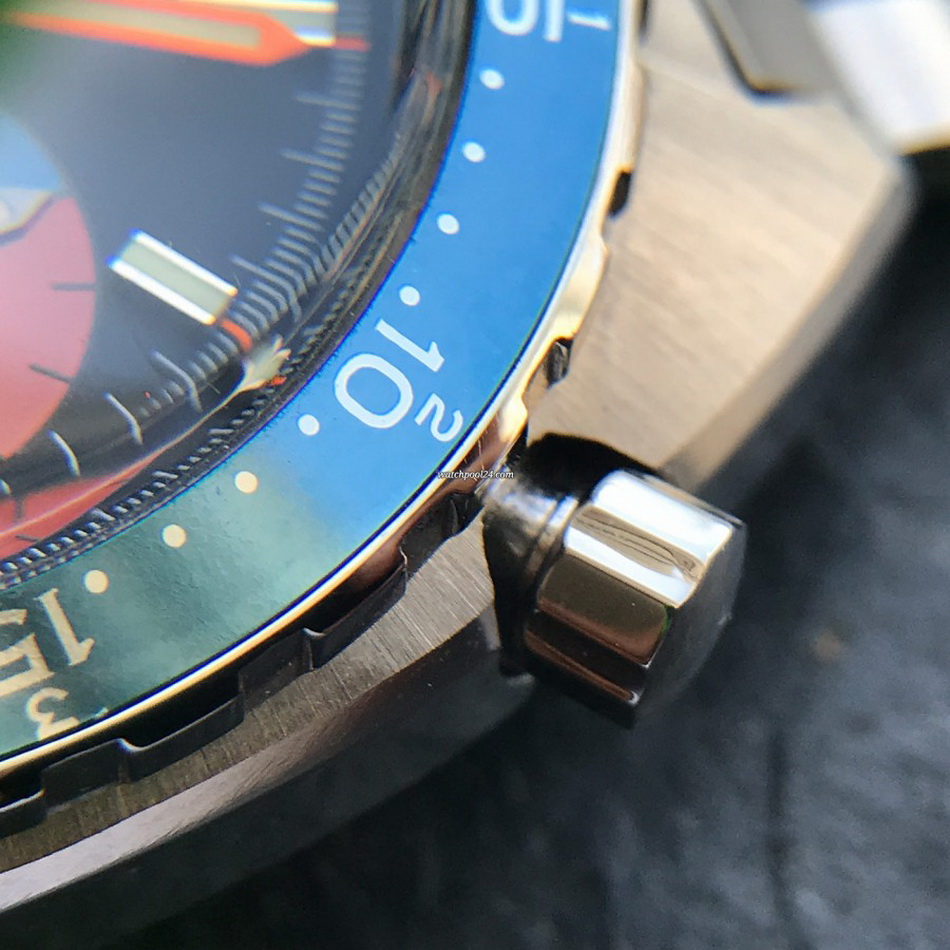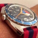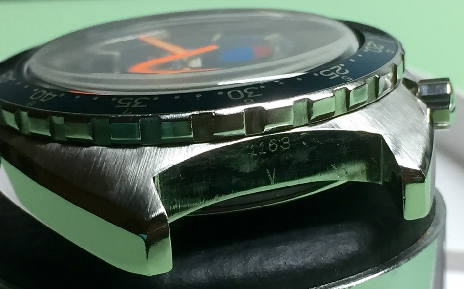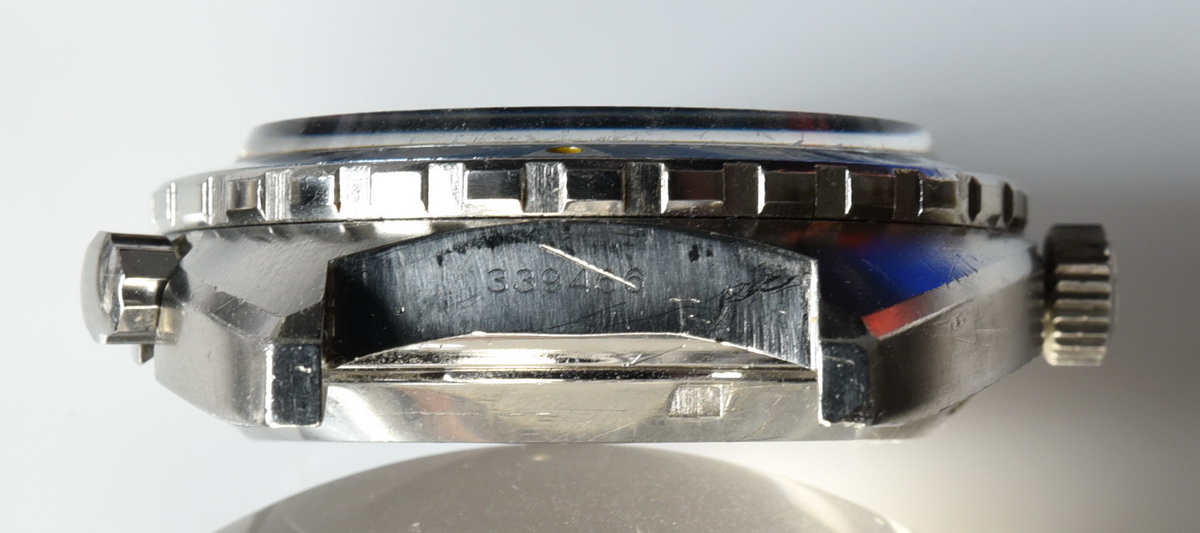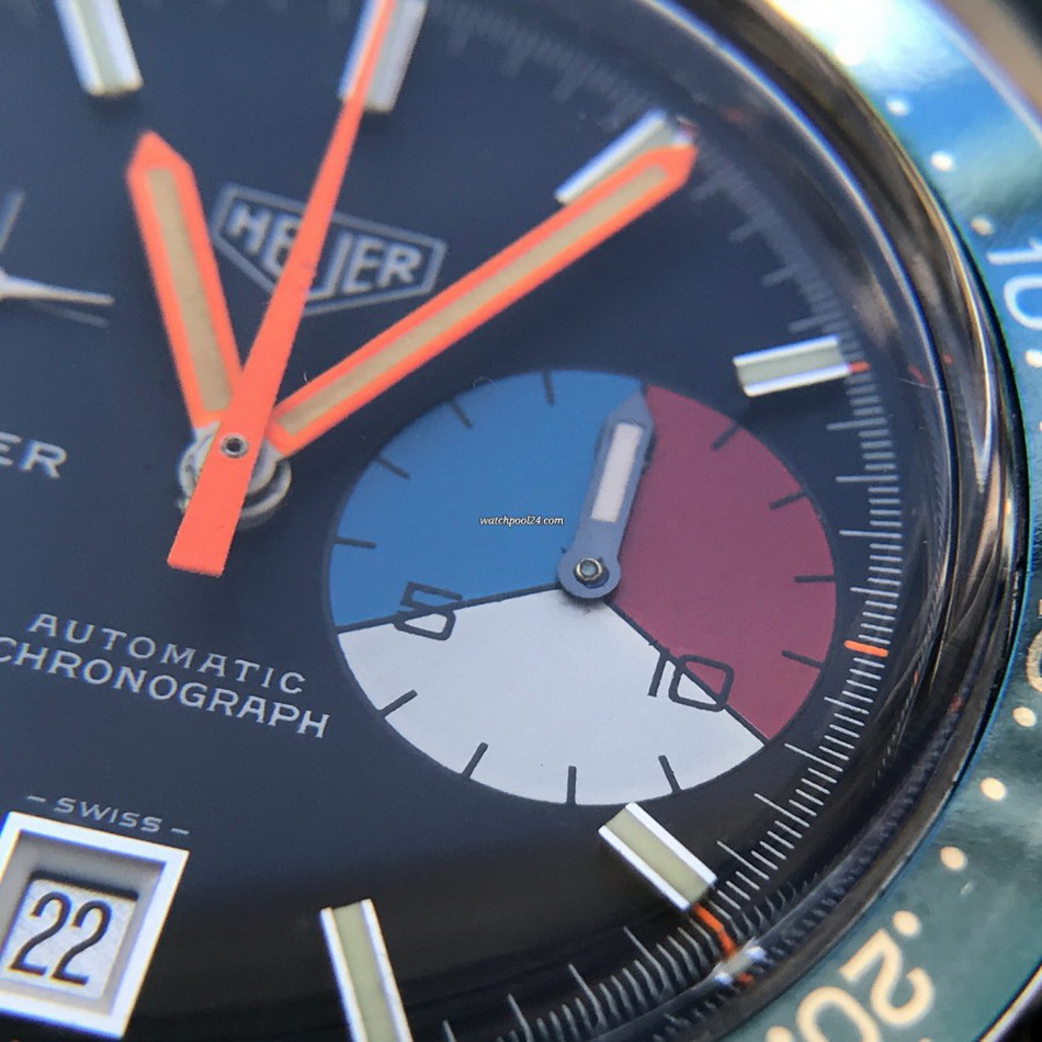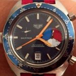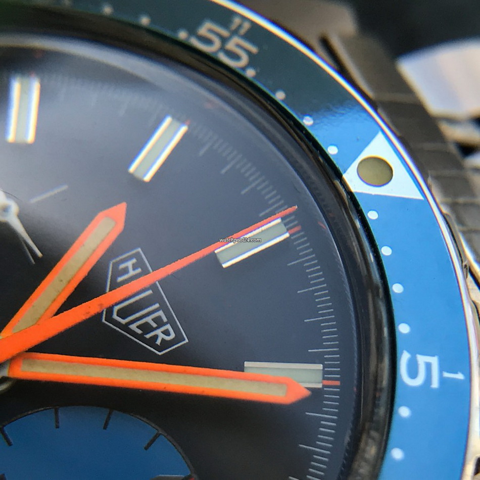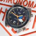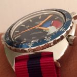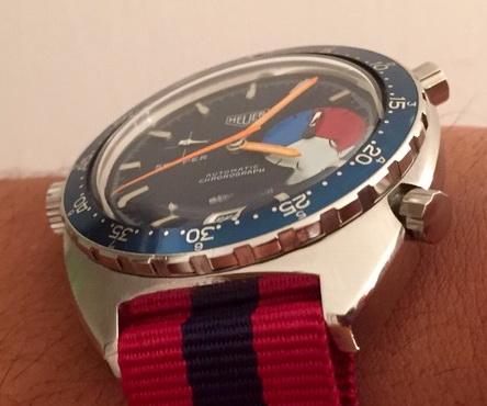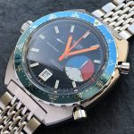 The Skipper Reference 1564 uses an Autavia screw-back case; has a blue dial; red, white and blue segments on minute recorder; orange hands with full luminous inserts; blue rotating MH bezel; automatic winding