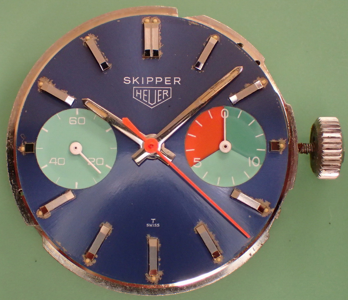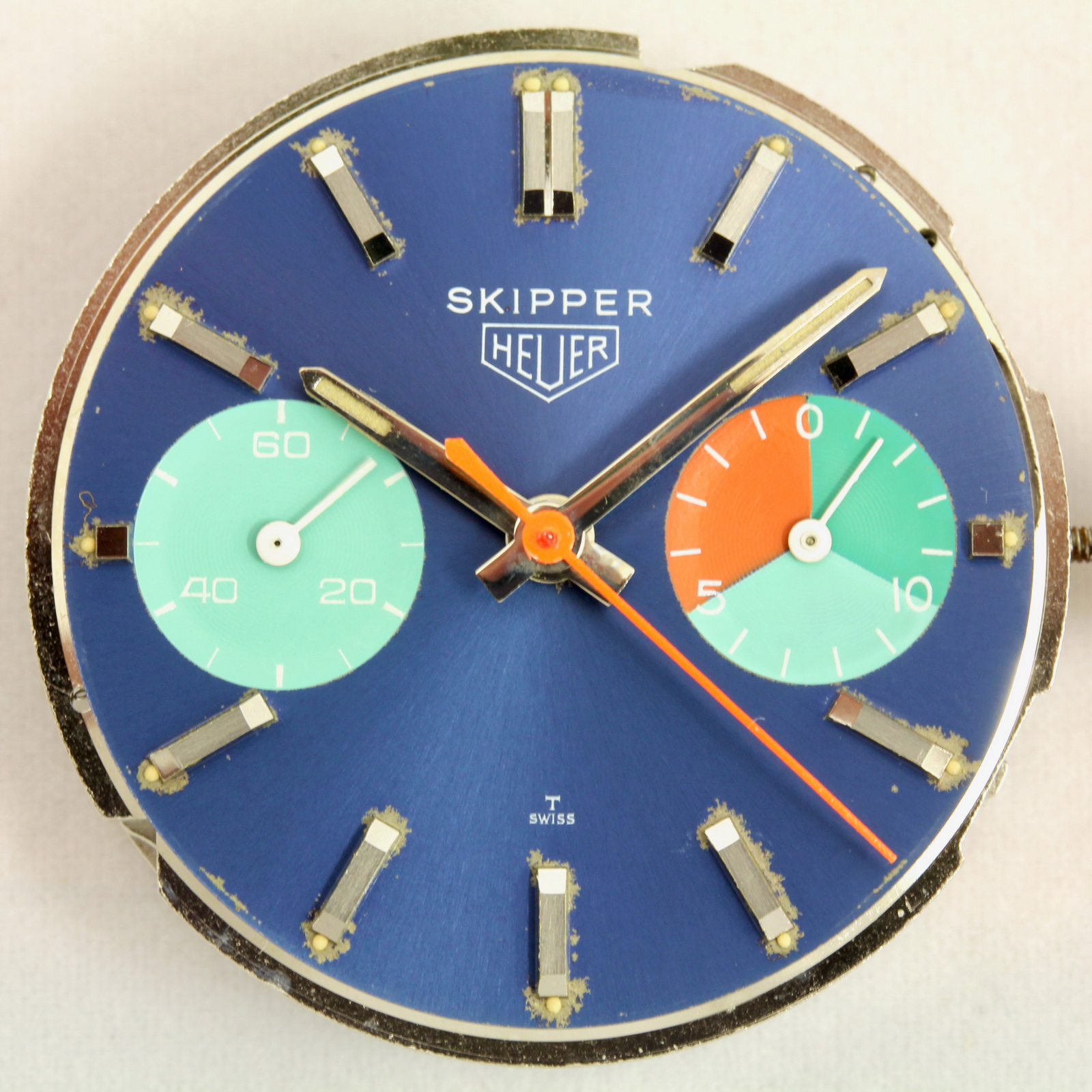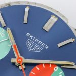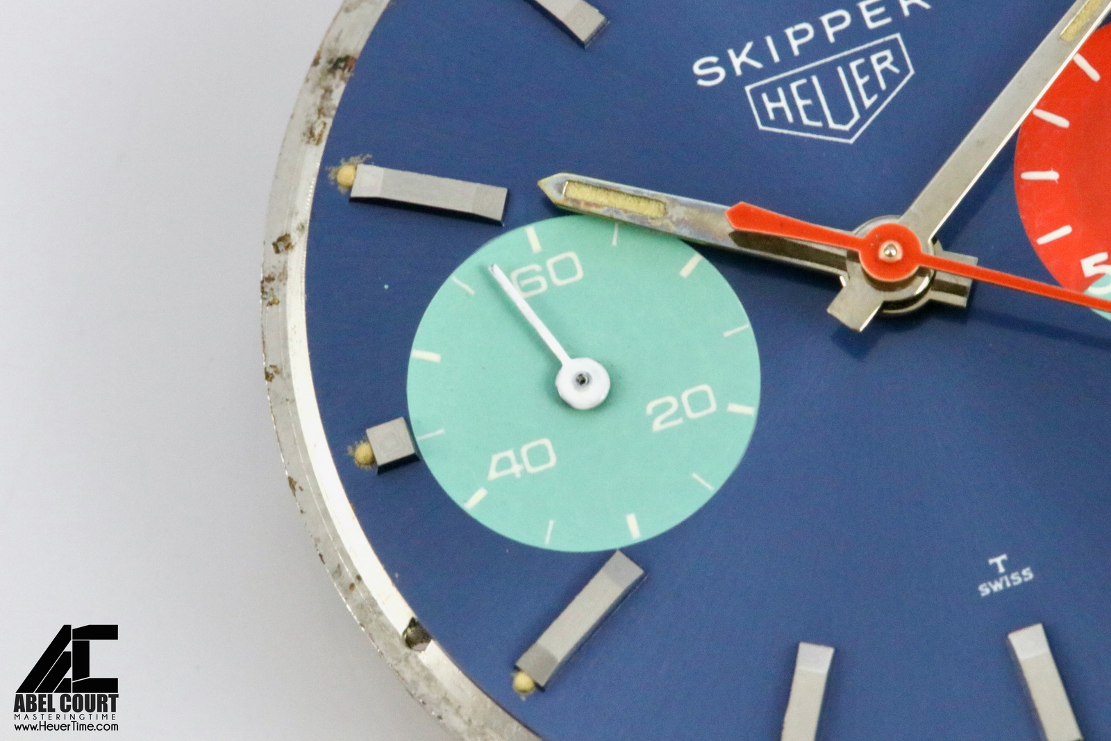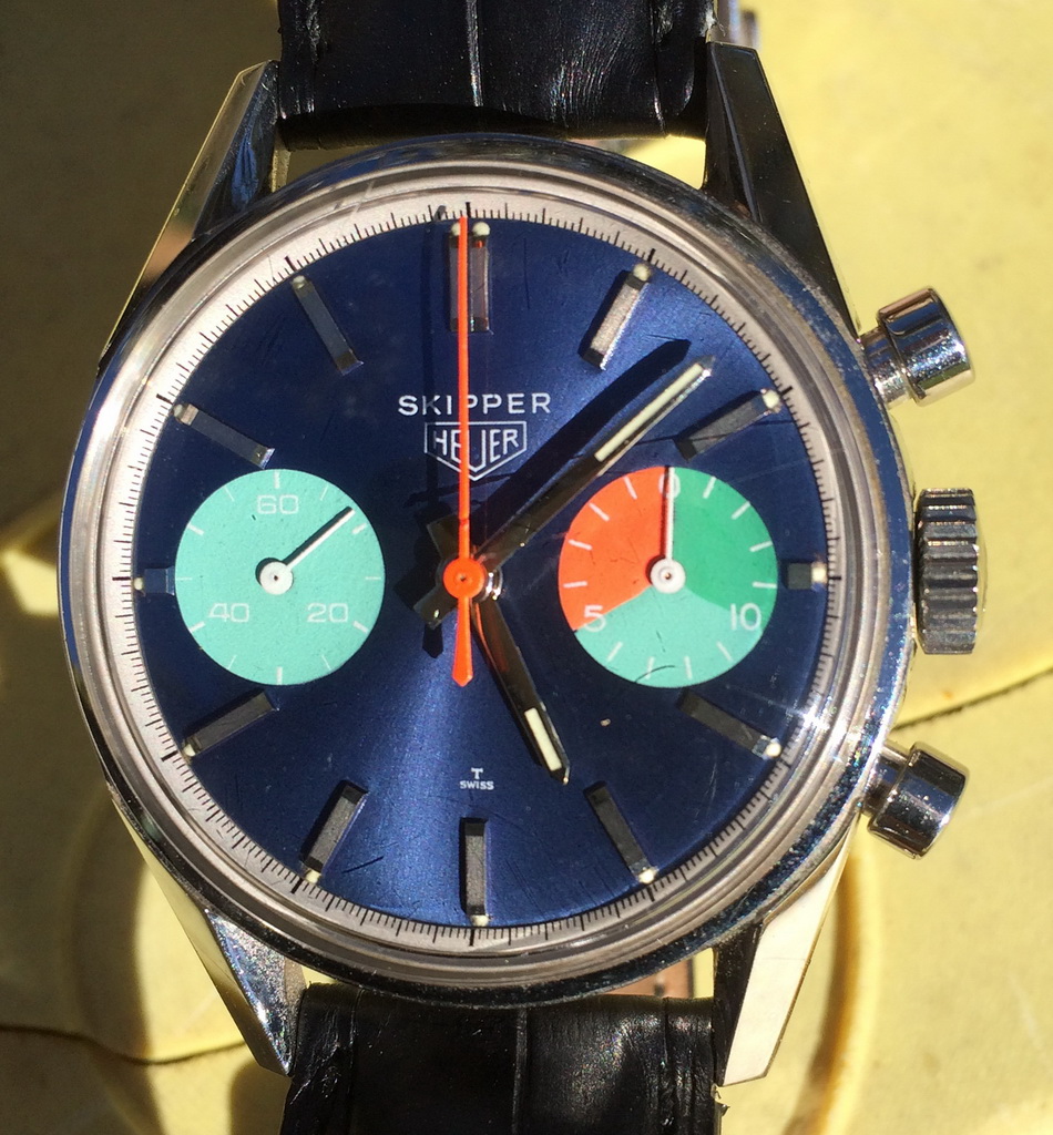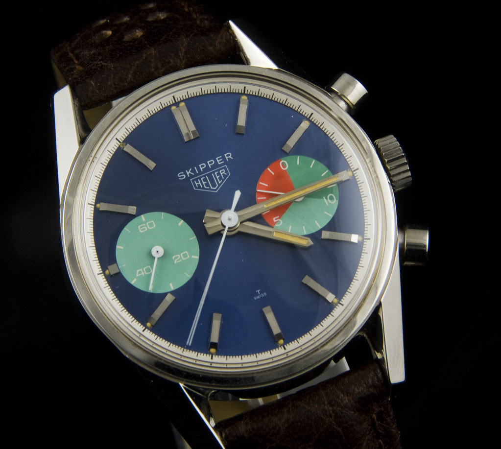 The Skipper Reference 7754 uses a Carrera case; has a blue dial; green, blue and orange segments on the minute recorder; polished steel hands; this is the only Skipper that does not have a rotating bezel. Known as the "Skipperrera".