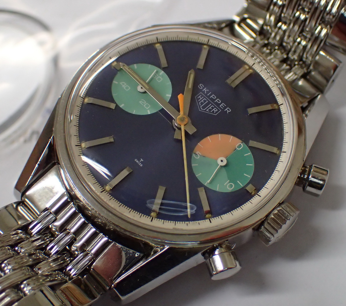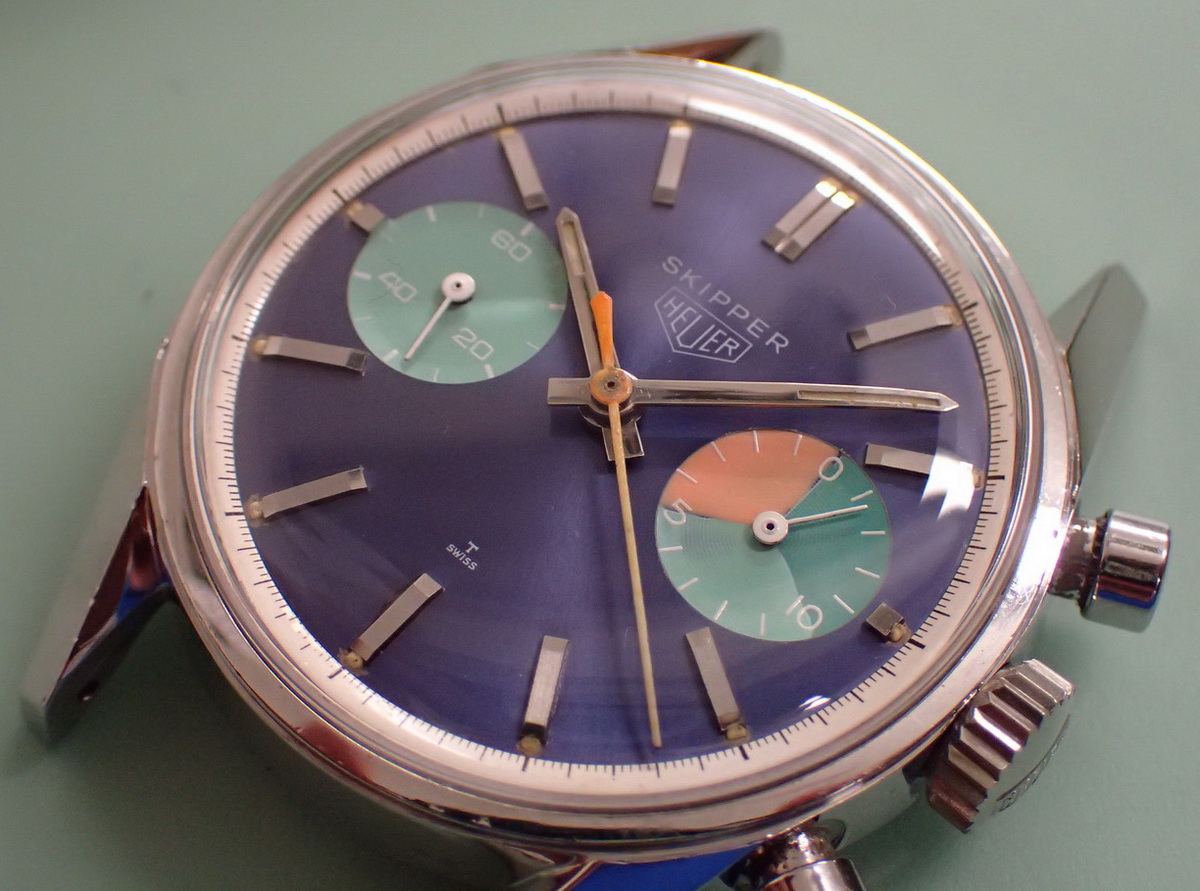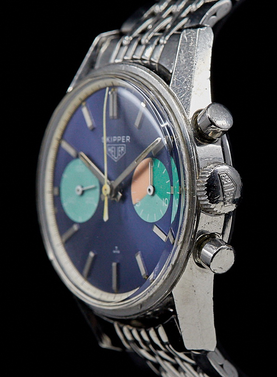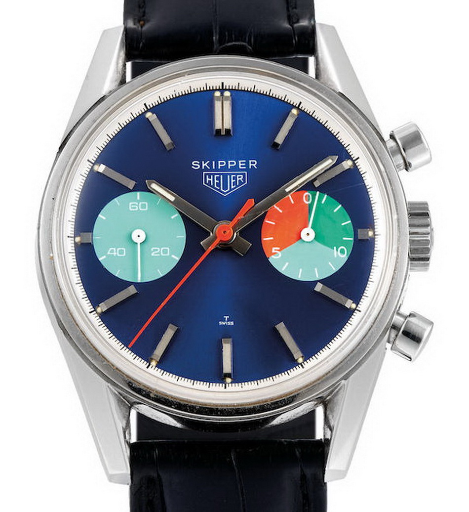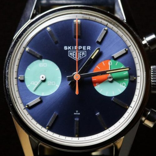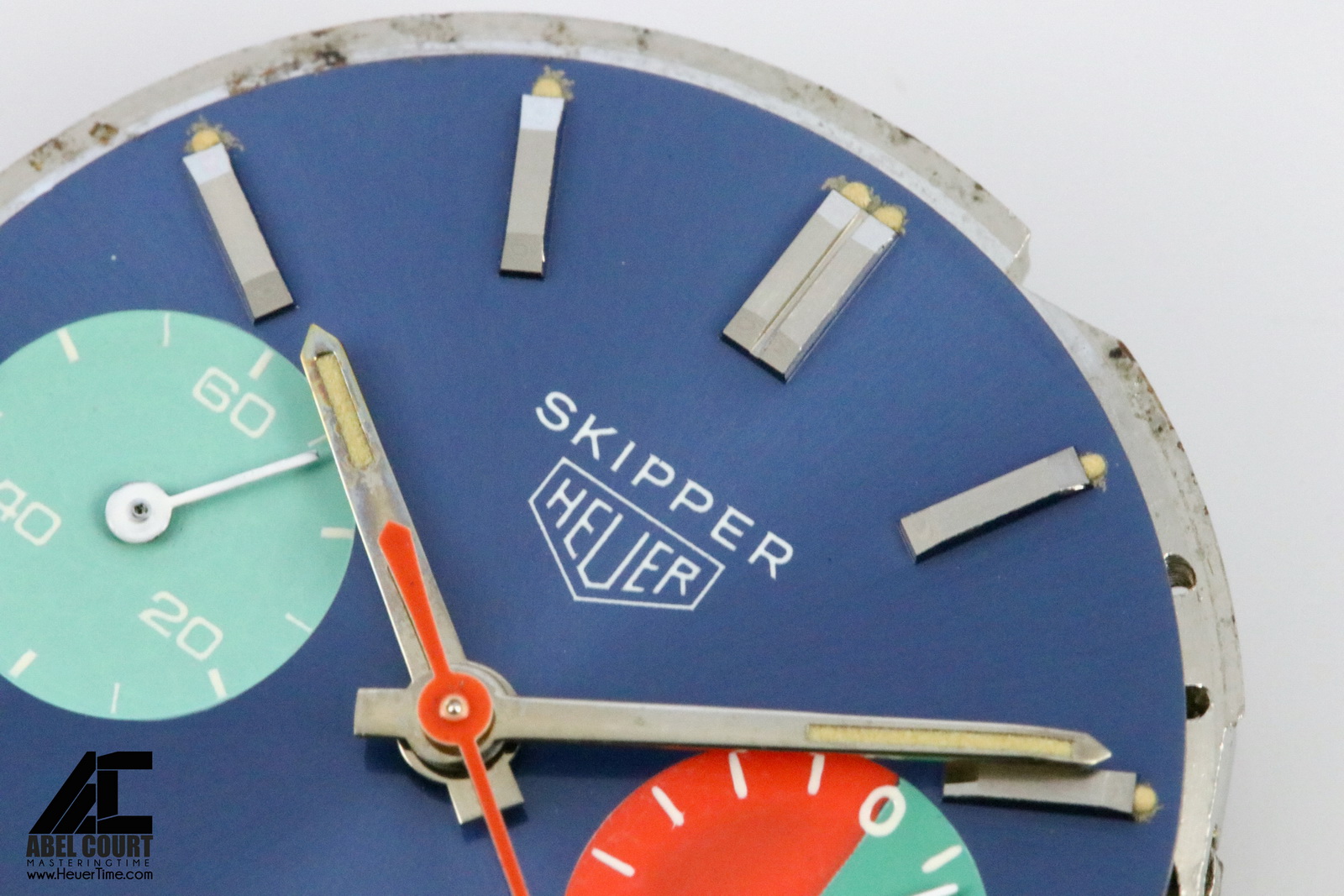 The Skipper Reference 7754 uses a Carrera case; has a blue dial; green, blue and orange segments on the minute recorder; polished steel hands; this is the only Skipper that does not have a rotating bezel. Known as the "Skipperrera".