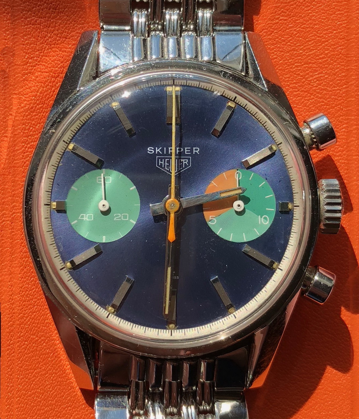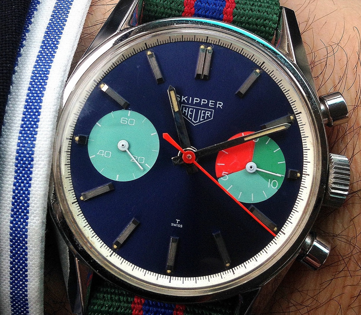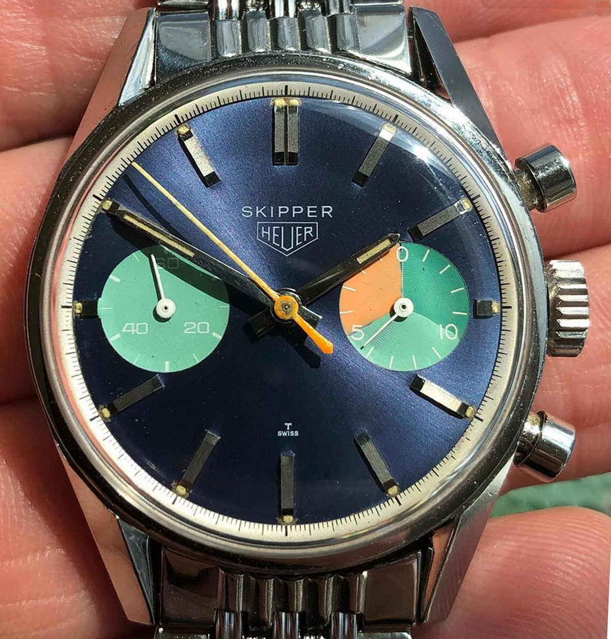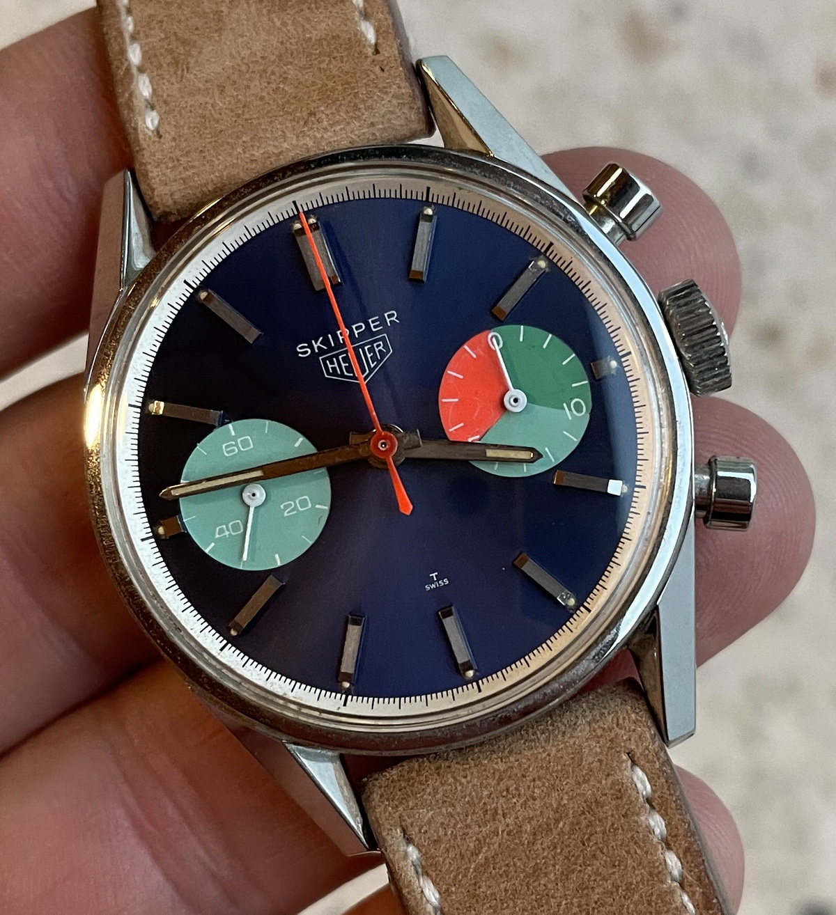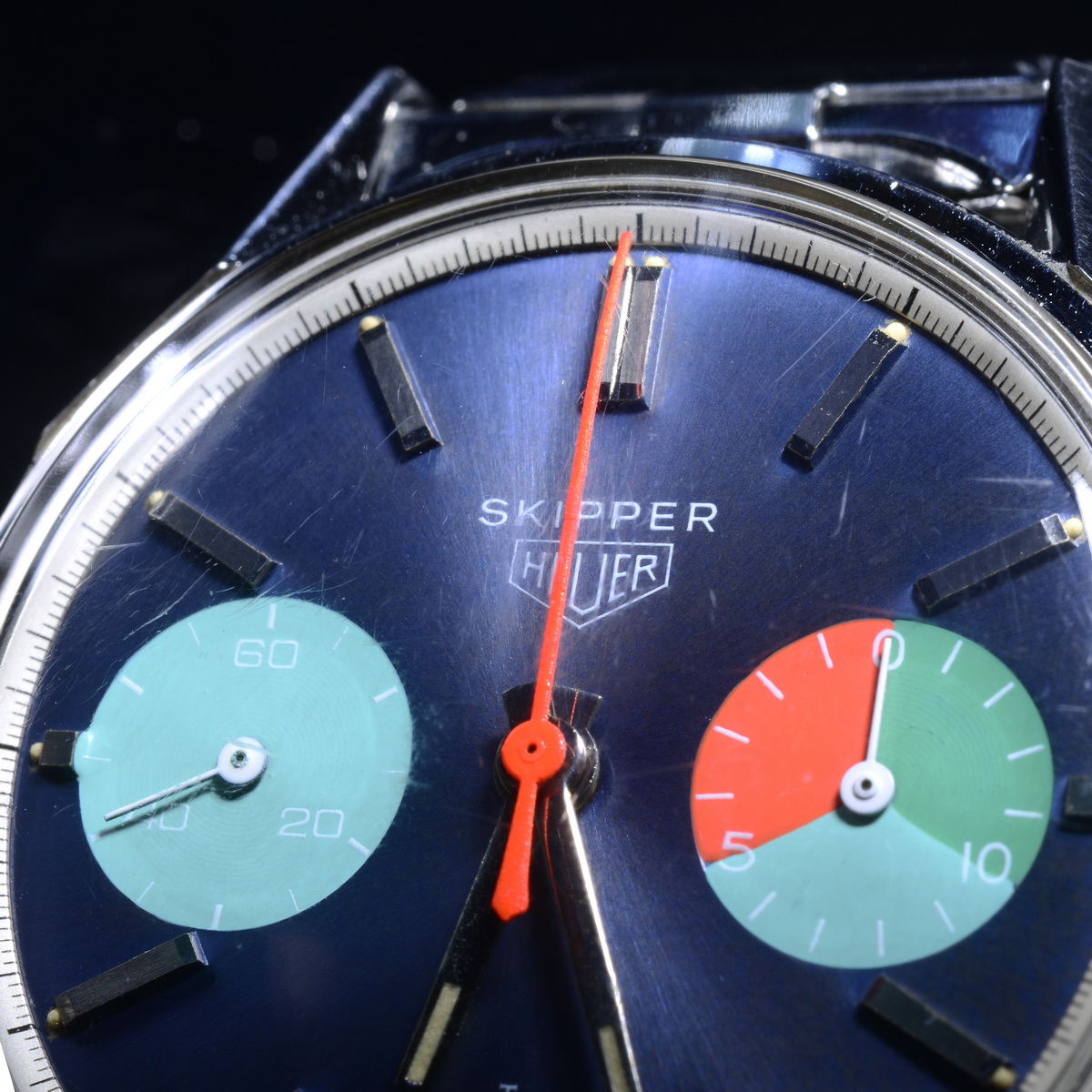 The Skipper Reference 7754 uses a Carrera case; has a blue dial; green, blue and orange segments on the minute recorder; polished steel hands; this is the only Skipper that does not have a rotating bezel. Known as the "Skipperrera".