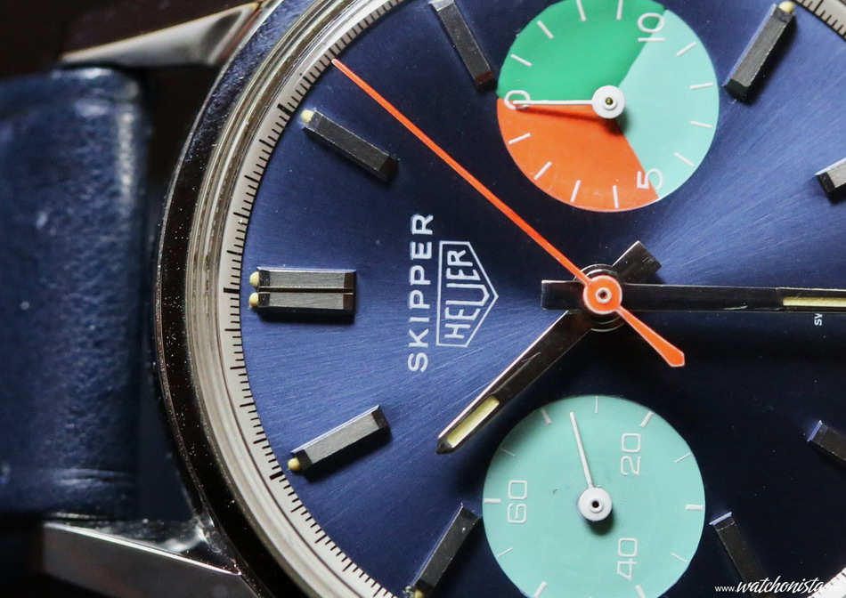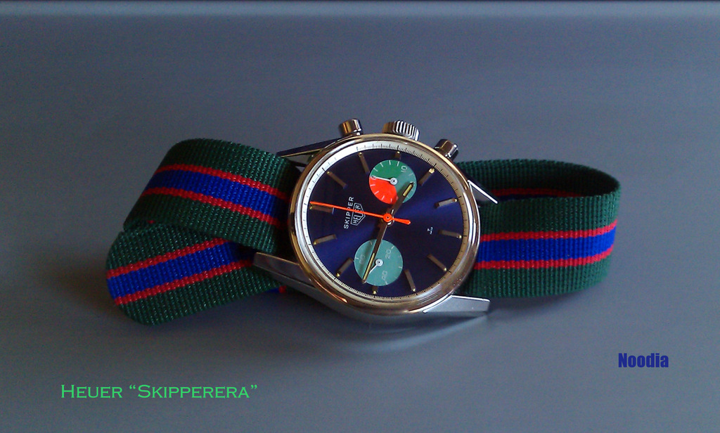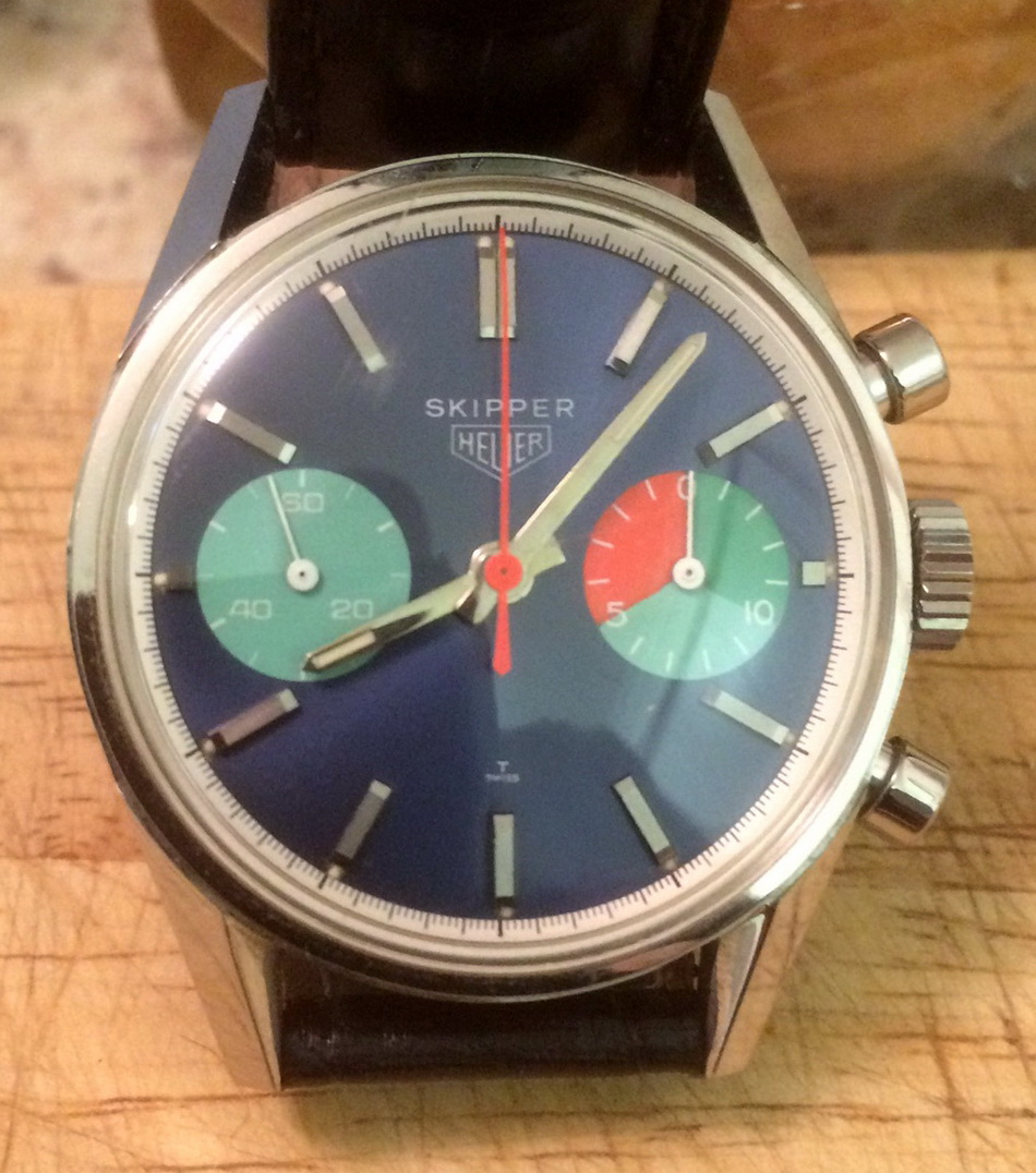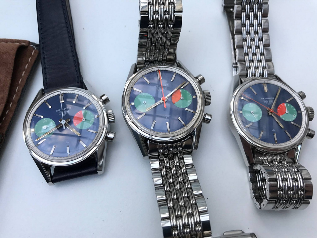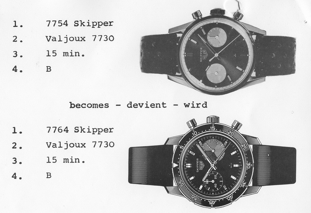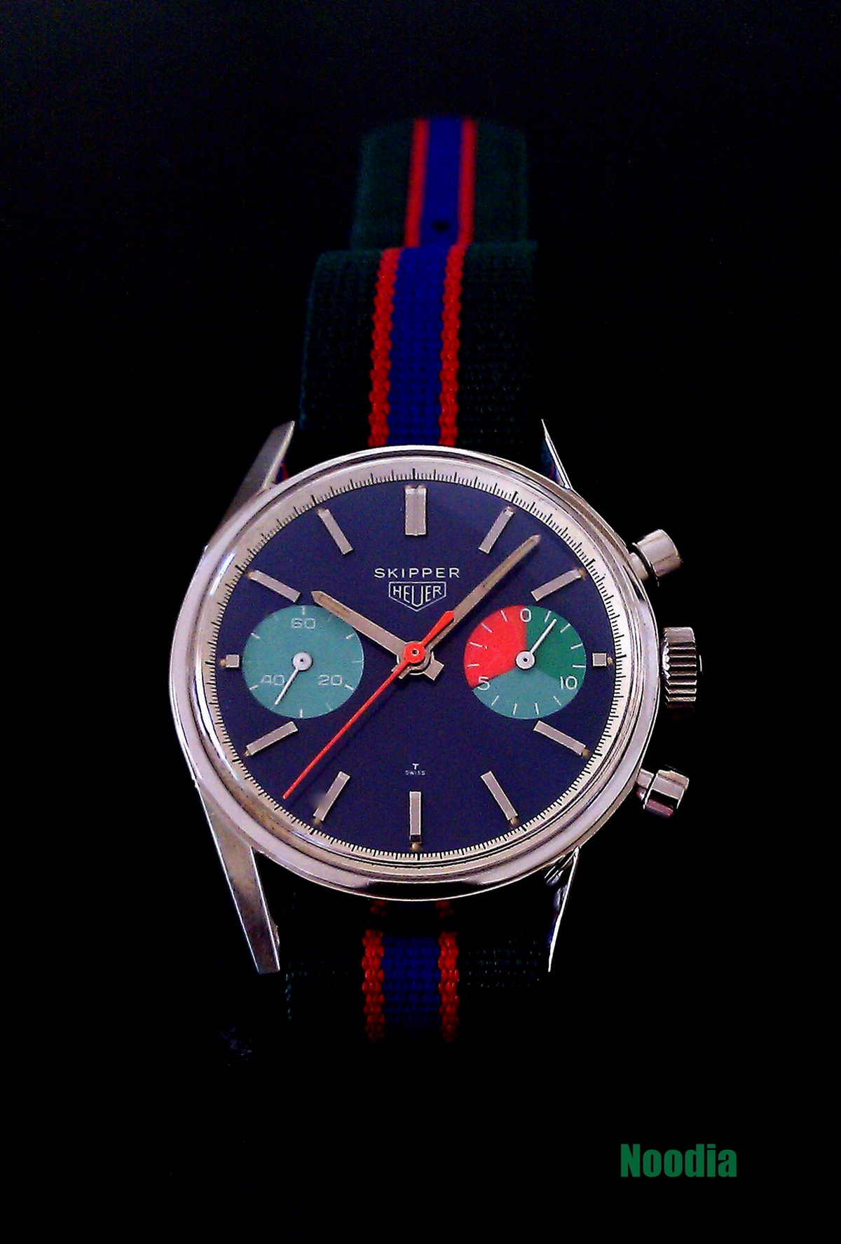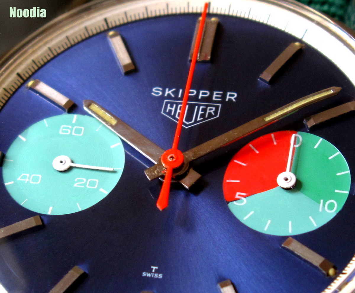 The Skipper Reference 7754 uses a Carrera case; has a blue dial; green, blue and orange segments on the minute recorder; polished steel hands; this is the only Skipper that does not have a rotating bezel. Known as the "Skipperrera".