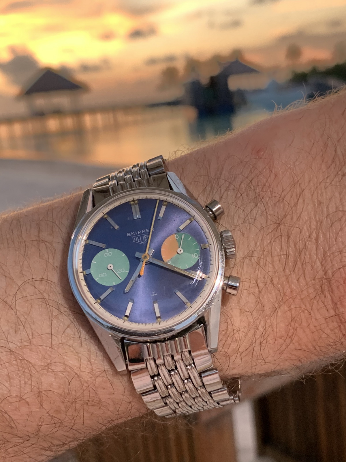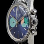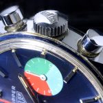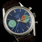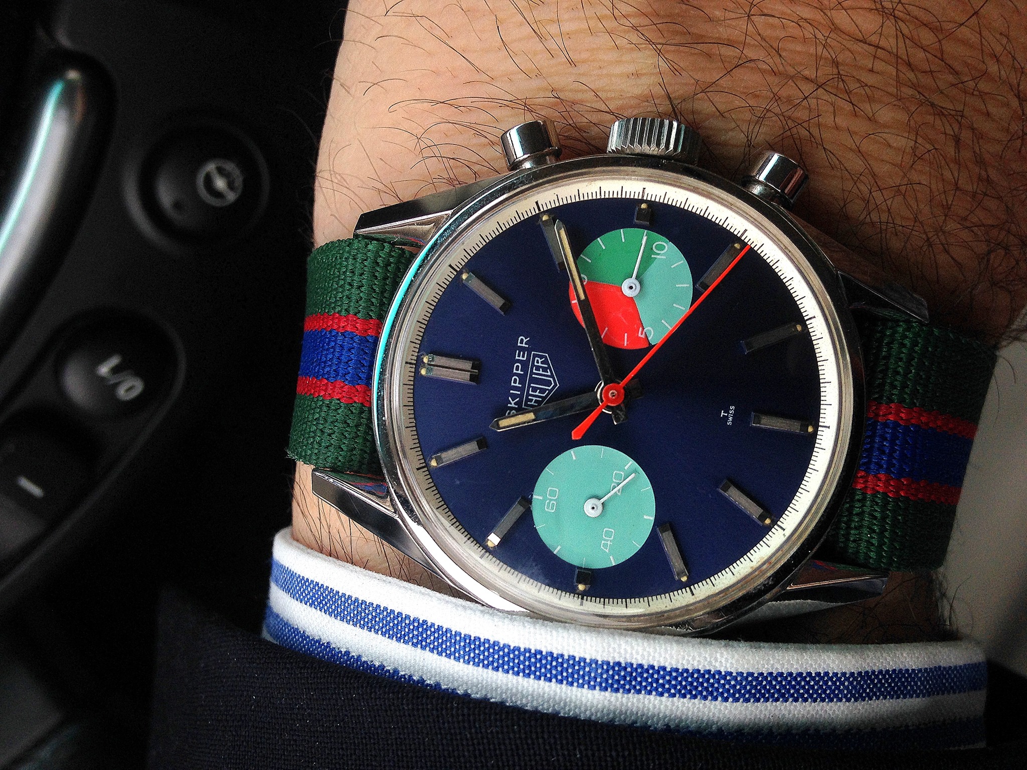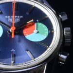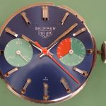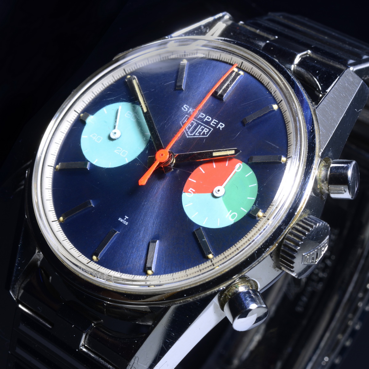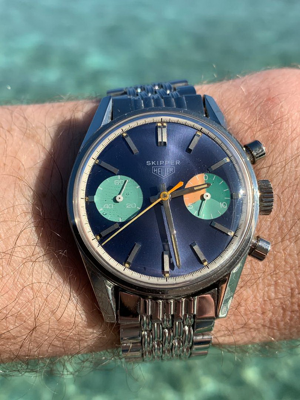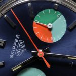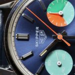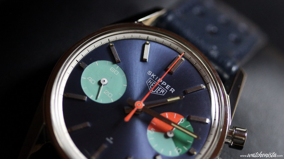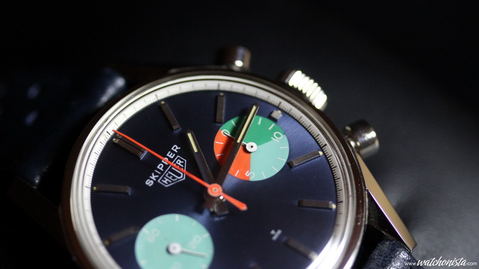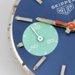 The Skipper Reference 7754 uses a Carrera case; has a blue dial; green, blue and orange segments on the minute recorder; polished steel hands; this is the only Skipper that does not have a rotating bezel. Known as the "Skipperrera".