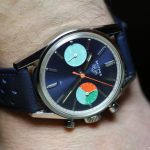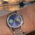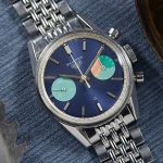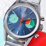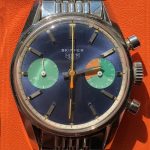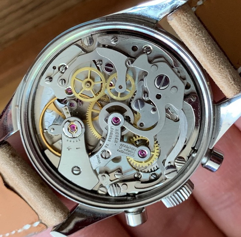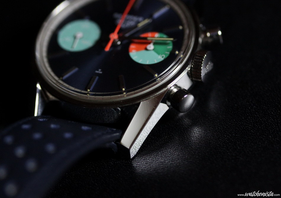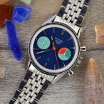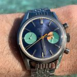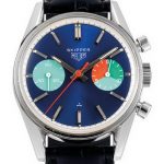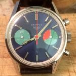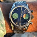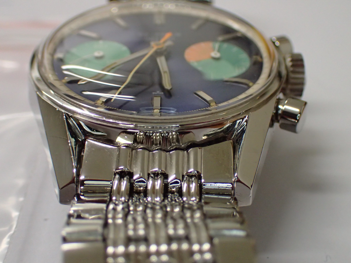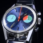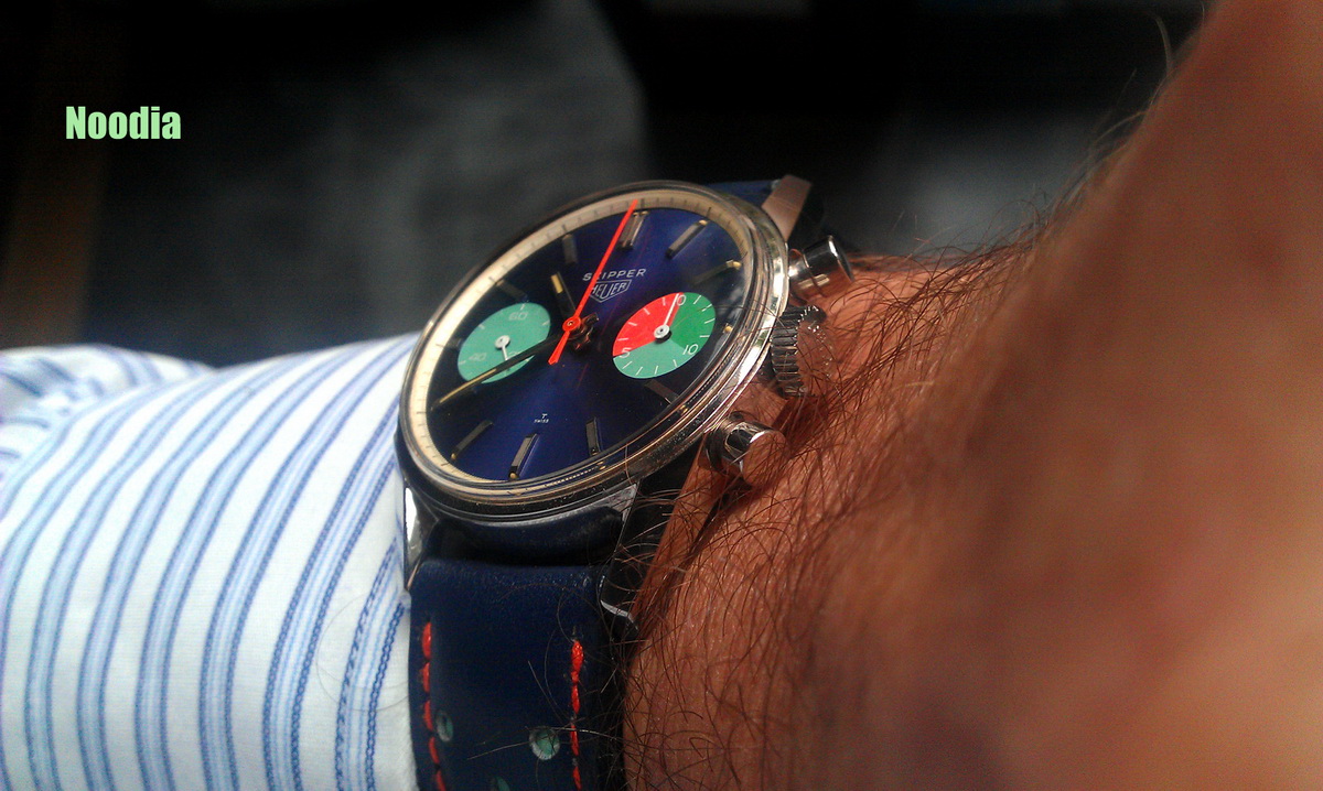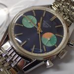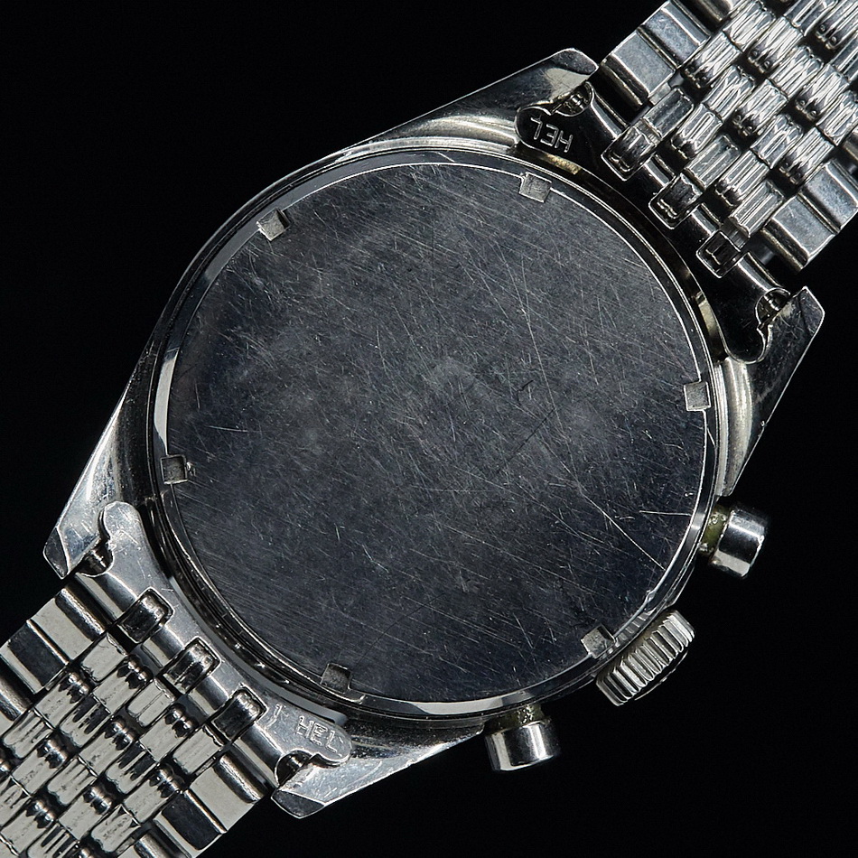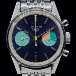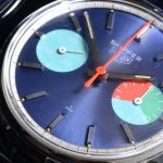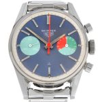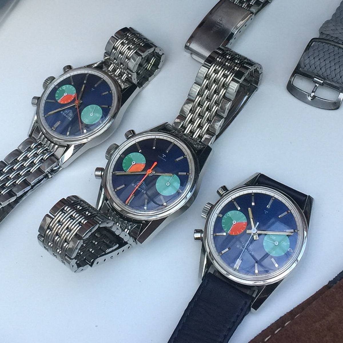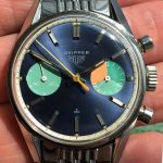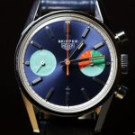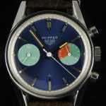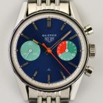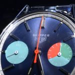 The Skipper Reference 7754 uses a Carrera case; has a blue dial; green, blue and orange segments on the minute recorder; polished steel hands; this is the only Skipper that does not have a rotating bezel. Known as the "Skipperrera".