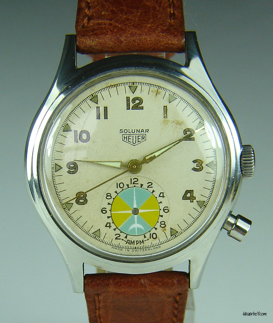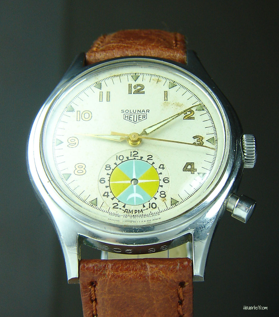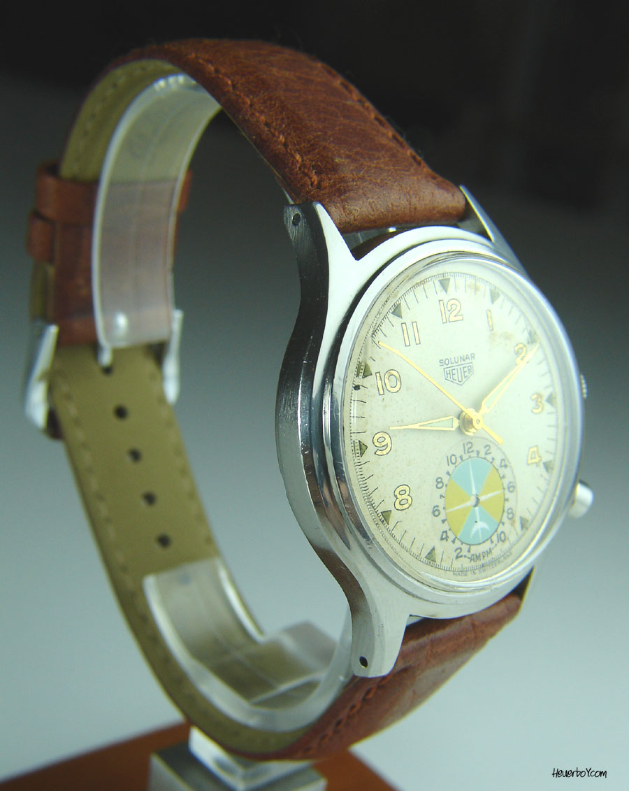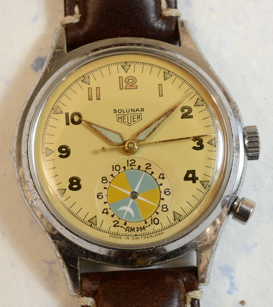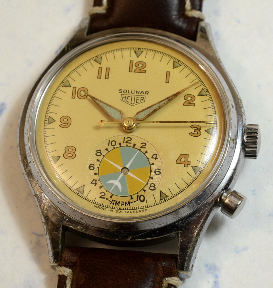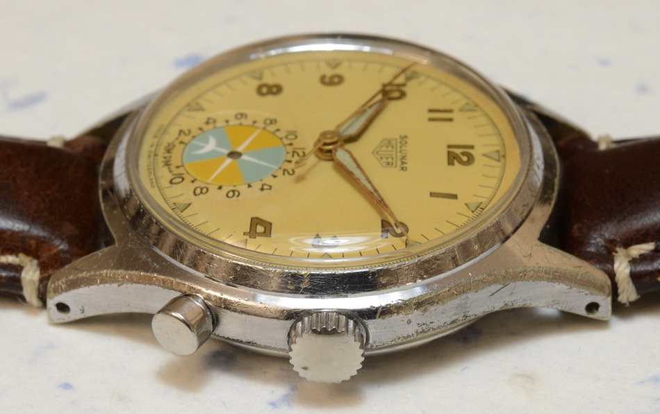 Second execution Solunar has capped pusher for tide dial; uses modified A. Schild 1188 movement