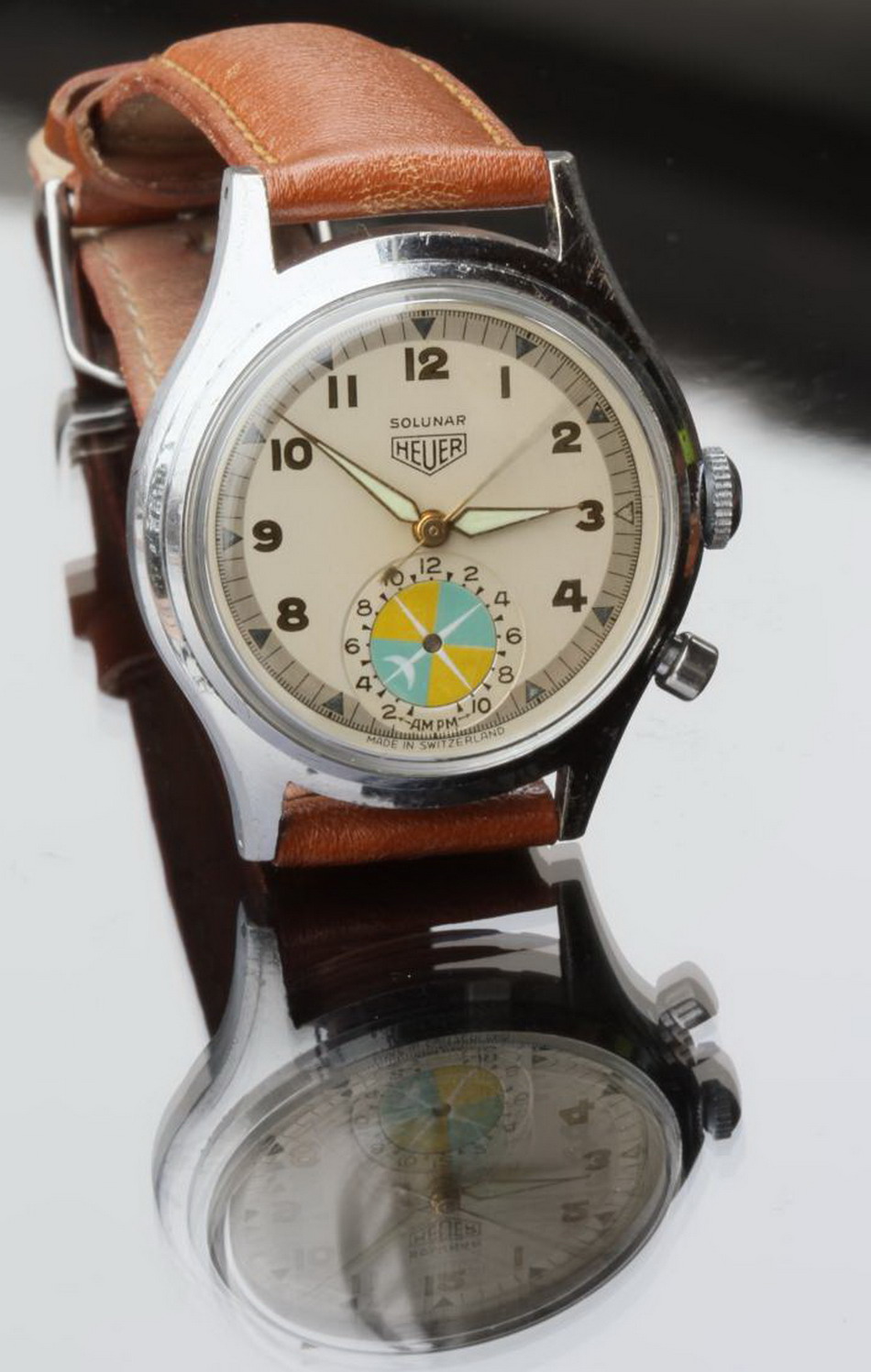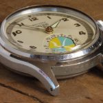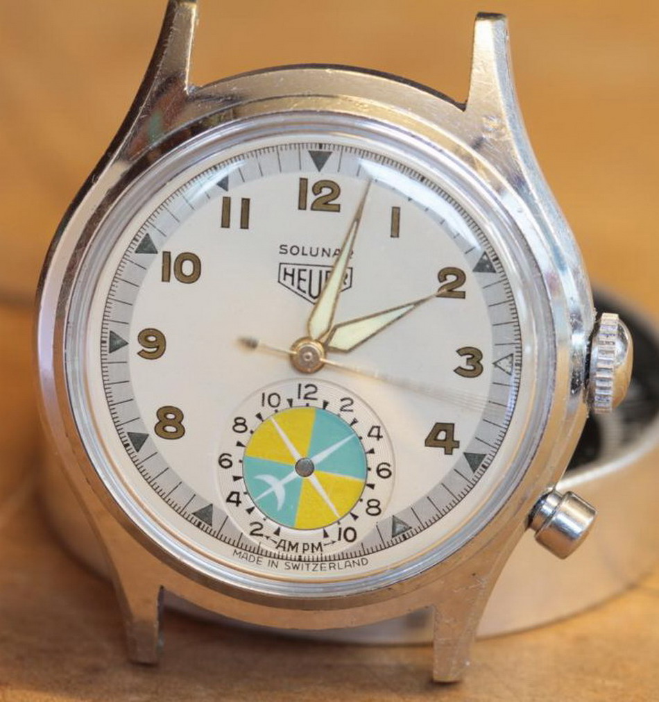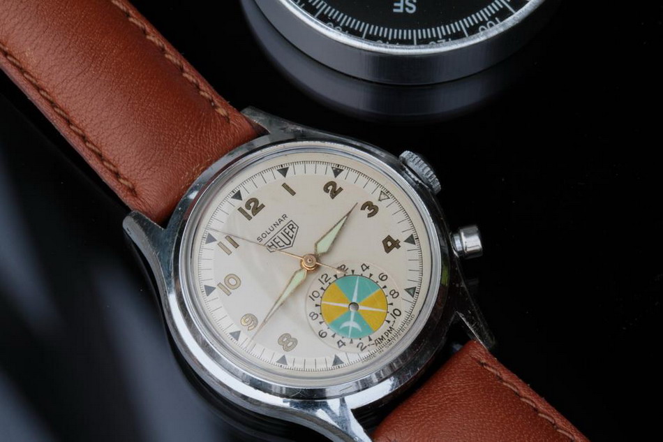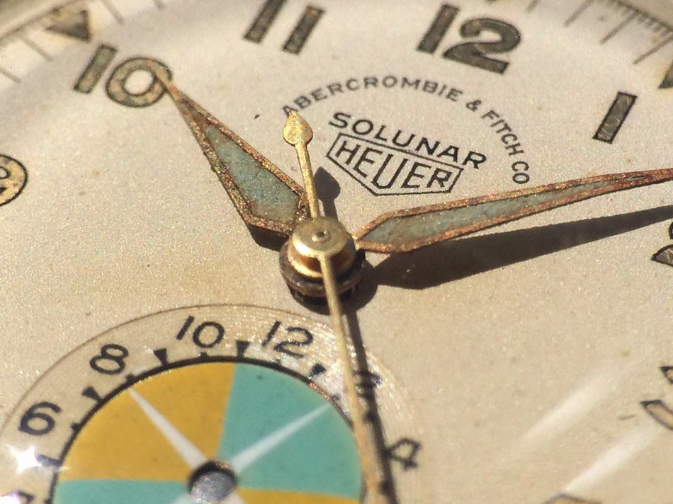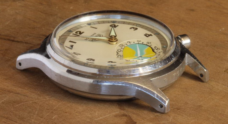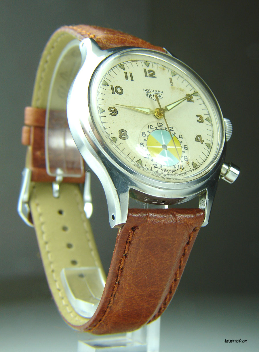 Second execution Solunar has capped pusher for tide dial; uses modified A. Schild 1188 movement