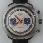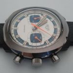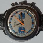 Brushed steel, with black and luminous inserts and orange tips; orange chronograph hands.