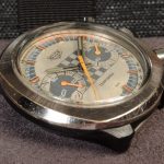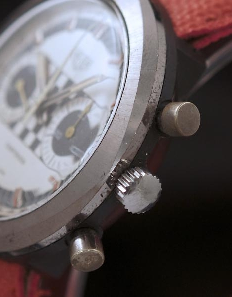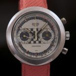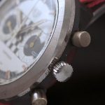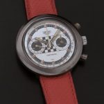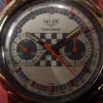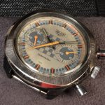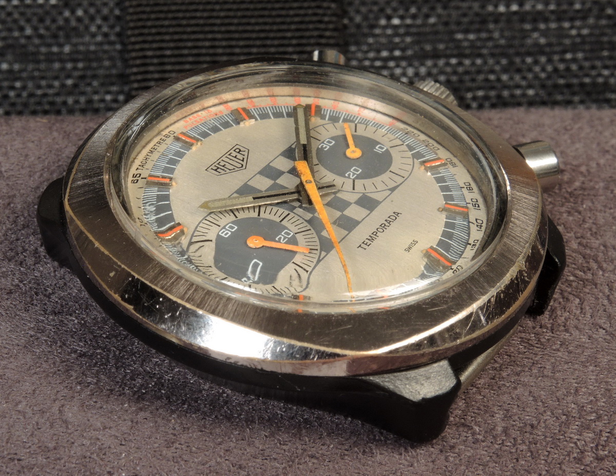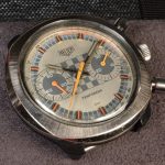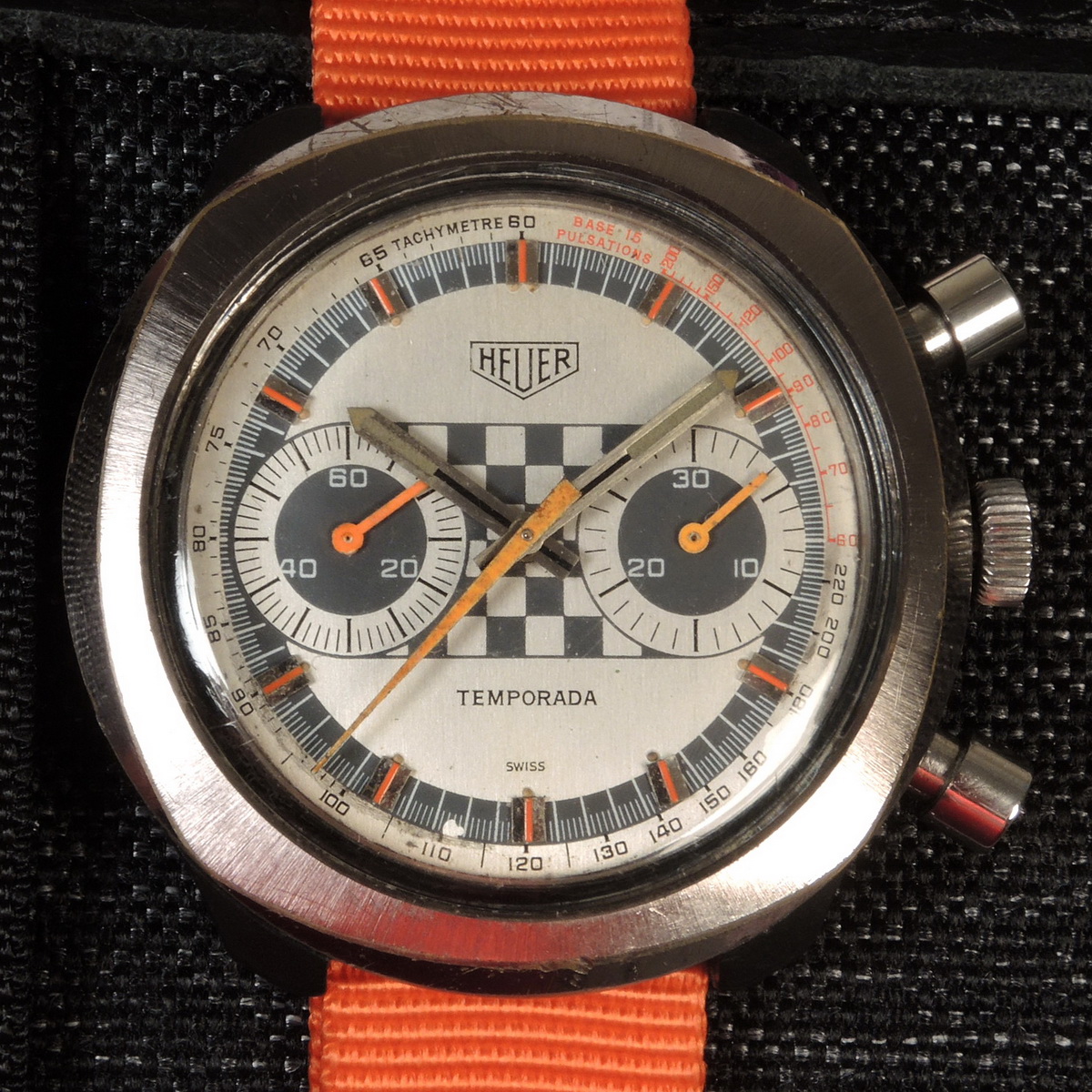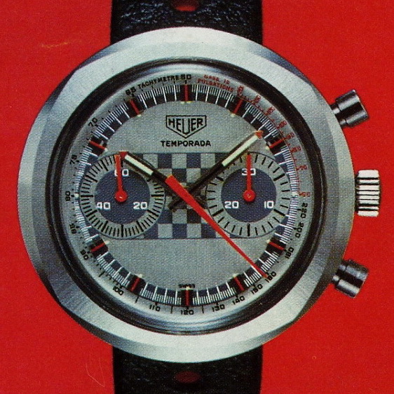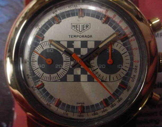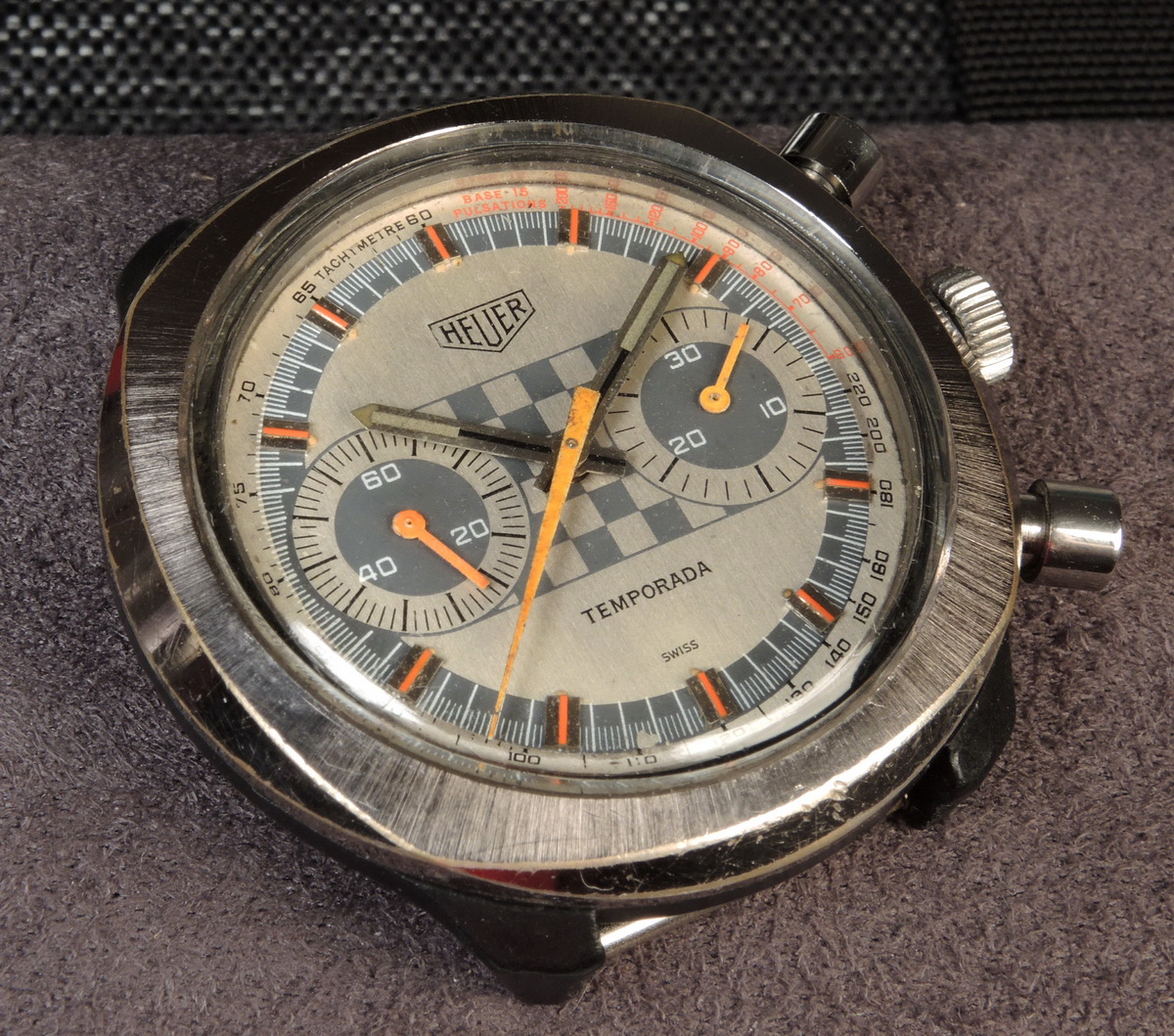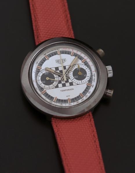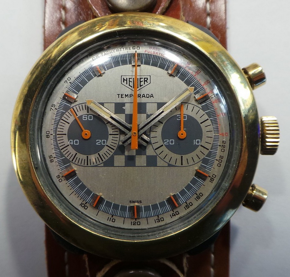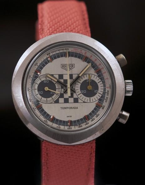 Racing model has silver dial, with gray accents, and checkerboard pattern at center of dial and round registers