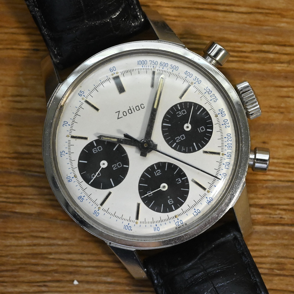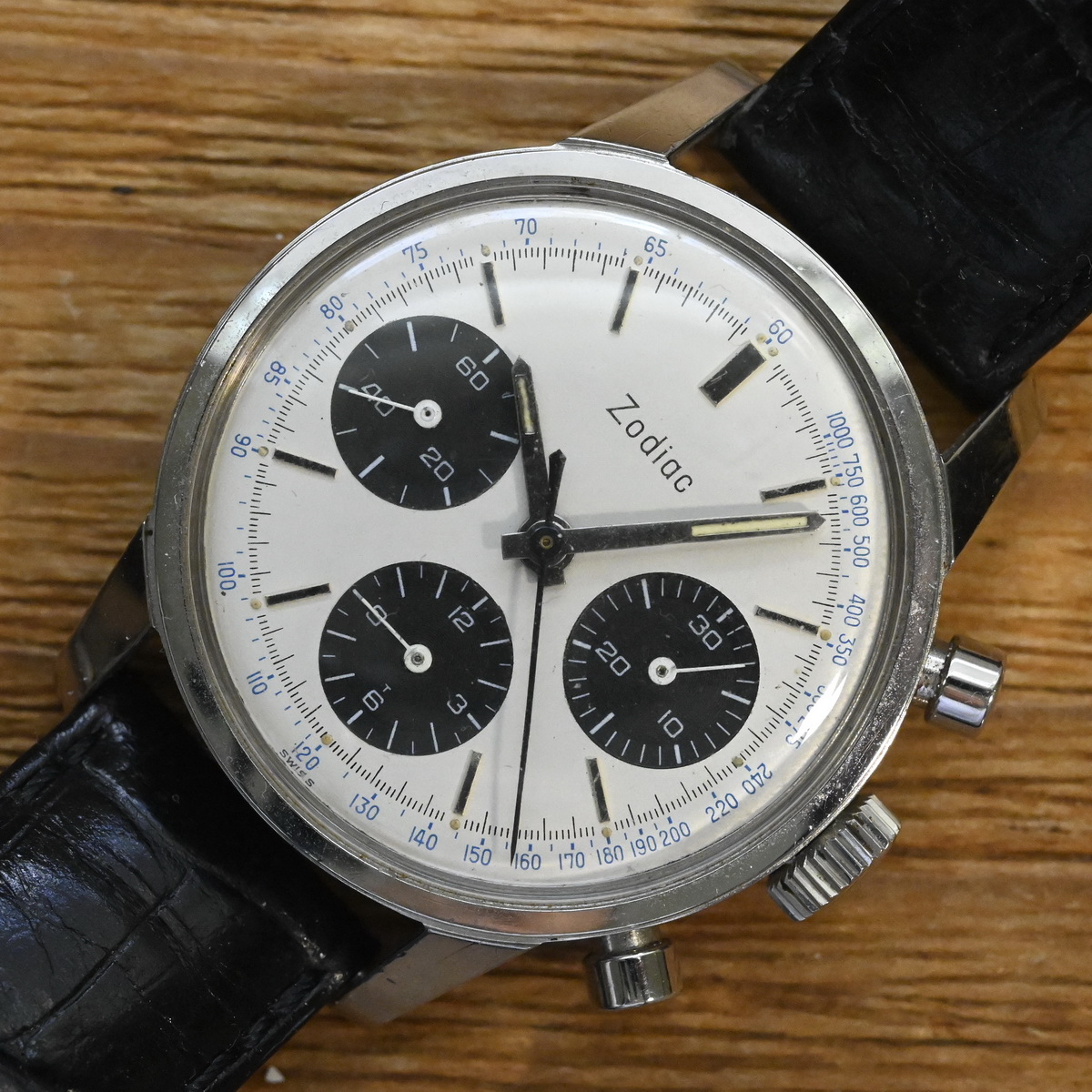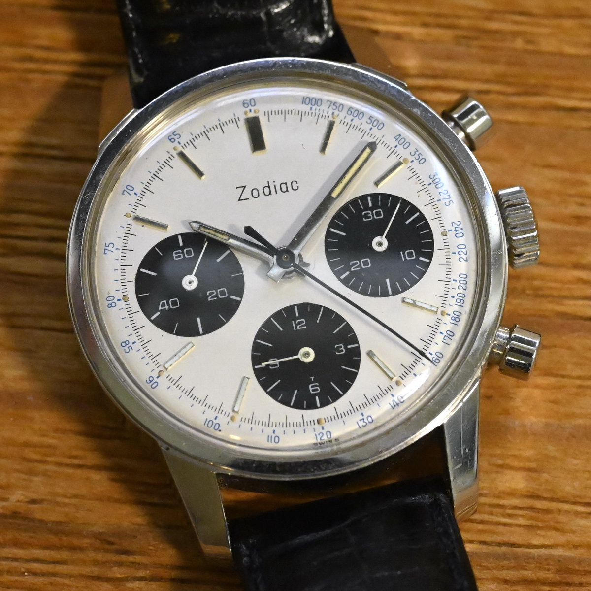 Zodiac Reference 4555 SNT has white dial with black registers, and a tachymeter scale printed on the dial