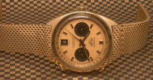 The 18 karat gold automatic Carreras were — far and away — the most expensive chronographs that Heuer ever offered. Because of the high price, few dealers kept them in stock, and they were “special order” items.