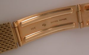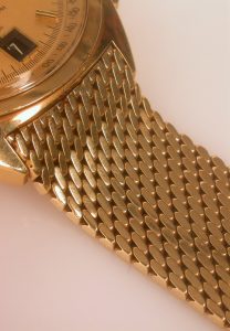 Construction of These Bracelets. The bracelet is constructed in “Maglia Milanese” style, comprised of hundreds of small links of gold, assembled into a thick mesh. The longer piece of the bracelet (without the clasp) is 82 millimeters and has 32 diagonal rows of links, with 13 links per row; the shorter piece of the bracelet (which has the clasp) is 65 millimeters, without the clasp, and has 25 diagonal rows of links, with 13 links per row. The clasp is polished gold and stamped with the Heuer logo. One piece of the clasp is marked “750” (meaning 18 karat), “GF” (for Guy Frers, the manufacturer of the bracelet) and “Swiss Made”; the other piece of the clasp shows the date of production (by the quarter and year, for example 4/72). The bracelet is adjustable within the clasp, but the links may not be removed.