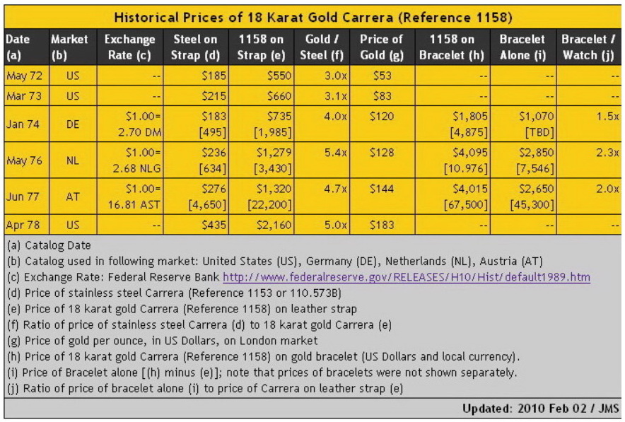 The following table provides information about the prices of the Reference 1158 Carreras, and their special bracelets, as shown in various catalogs over the period from May 1972 through April 1978. This table shows us that the 18 karat gold Carreras sold in a range between 3.0 and 5.4 times the price of the steel Carreras, and that the special bracelets for the 18 karat gold Carreras sold for between 1.5 and 2.3 times the price of the watch itself (on a leather strap). For example, in May 1976, we see that the steel Carrera sold for $236, while the 18 karat gold Carrera sold for $1,279 (on a strap), and the 18 karat gold bracelet for the Carrera sold for approximately $2,850. The Carrera with the bracelet sold for over $4,000.