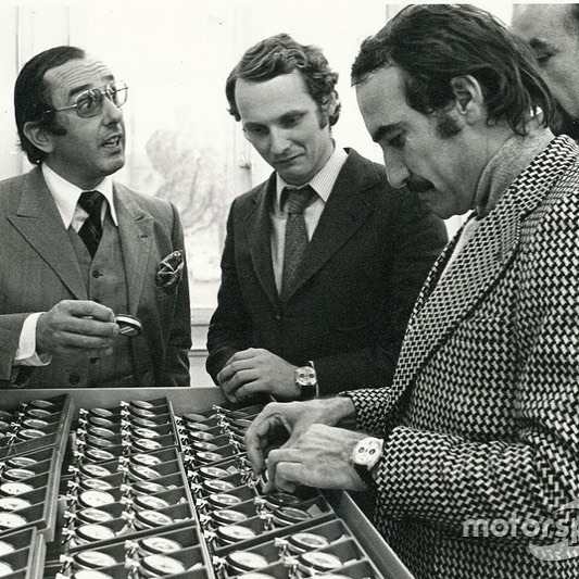 The Ferrari Drivers. Just as Heuer had the deal with the Ferrari racing team, under which the team displayed the Heuer logo in exchange for Heuer timing equipment, Heuer had a parallel arrangement with each of the Ferrari Formula One drivers from the period from 1971 through 1979. Each of the Ferrari drivers would wear a patch displaying the Heuer logo, in exchange for which Jack Heuer presented each of the drivers with timing equipment. In this instance, only one item of timing equipment would be provided — the 18 karat gold Carrera. Accordingly, Jack Heuer presented each Ferrari Formula One driver with one of these gold Carreras. Here is a list of the Ferrari drivers who would have received these Carreras: