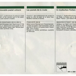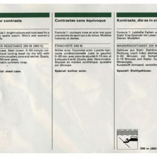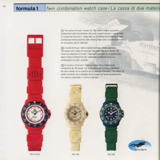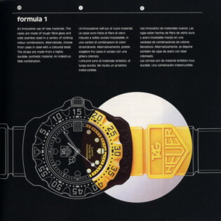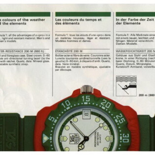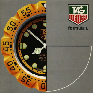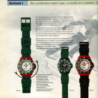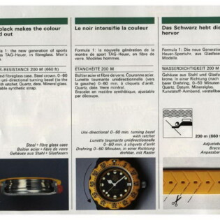 1986 Formula 1 Catalog. TAG Heuer used this catalog to introduce the Formula 1 collection. The catalog explains that the collection will combine the technology incorporated in the brand’s dive watches (200 meter waterproofing, unidirectional bezel and mineral crystal) with TAG Heuer’s success in Formula 1 racing, specifically with the Marlboro McLaren racing team.
