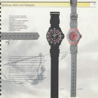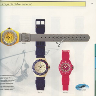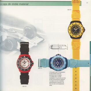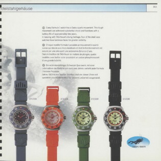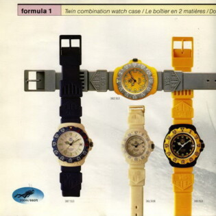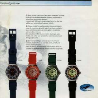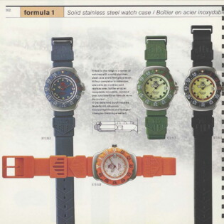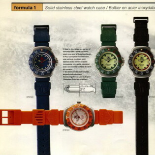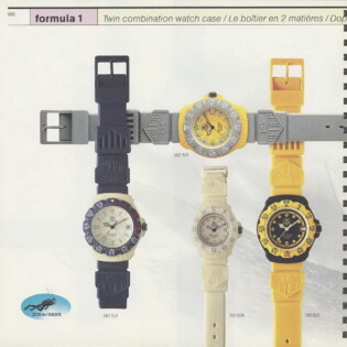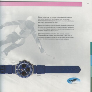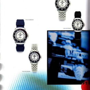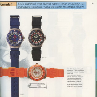 1995-96 General Catalog. In this catalog, we see the further development of the Formula 1 watches and the introduction of the second generation Formula 1 chronographs. For the first time, we see Formula 1 watches and chronographs on stainless steel extension bracelets.