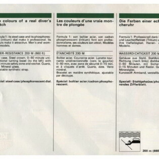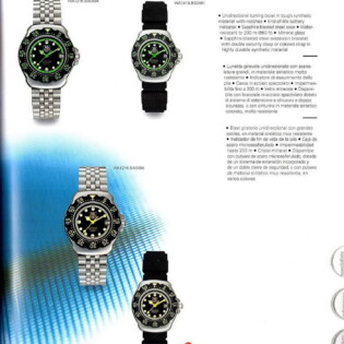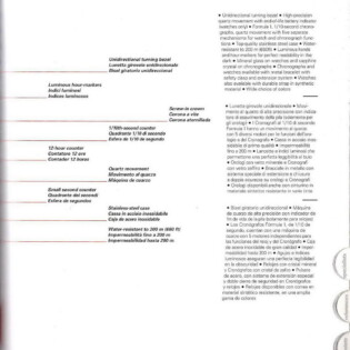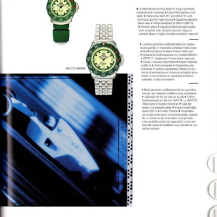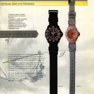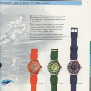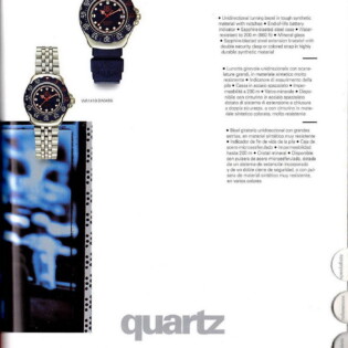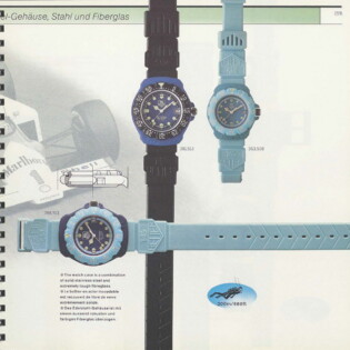 1987-88 Catalog. This catalog describes how the new Formula 1 watches may be worn in town, in the country or in the water. Some models have stainless steel cases and phosphorescent dials, making the models ideal for diving. It includes both models with “combination” cases and models with stainless steel cases.