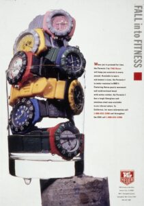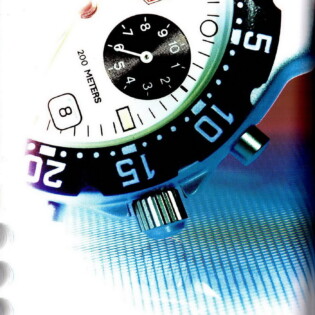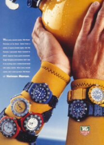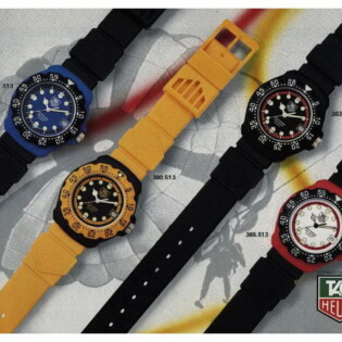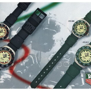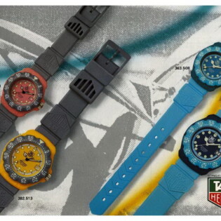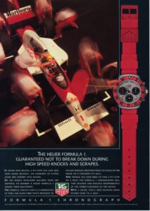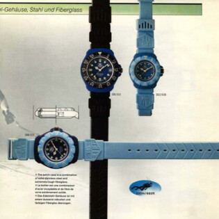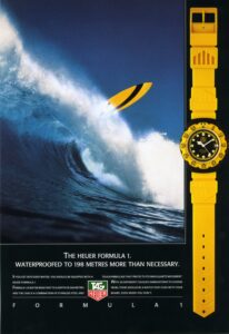 TAG Heuer took an interesting approach in advertising the Formula 1 watch when it was introduced in 1986. Yes, it was a dive watch, that reflected Heuer’s expertise in producing automatic and quartz dive watches over the period since 1978, but the name “Formula 1” and the bright colors also captured the excitement of motorsports. The following advertisement also emphasizes the position of Techniques d’Avant Garde — the new owner of TAG Heuer — as a leader in aviation and advanced technologies for boats. This appears to be an early advertisement, as it indicates that the new Formula 1 watch was available in
