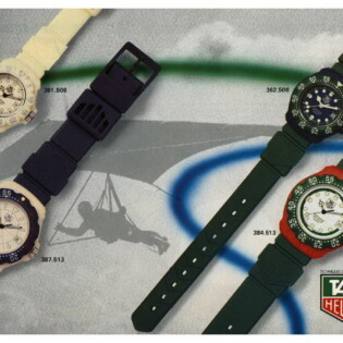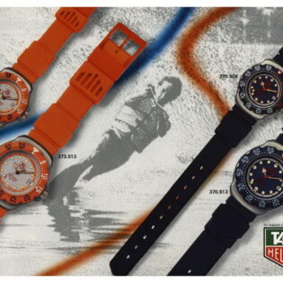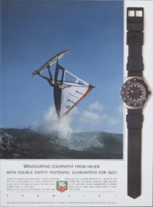 Shown below are some magazine advertisements for the first generation Formula 1 watches and chronographs. TAG Heuer used the imagery of both motor sports and water sports (diving, surfing and windsurfing) in marketing the watches.