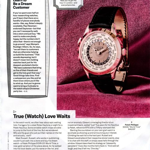 - True (Watch) Love Waits — Editor Cam Wolf tells the stories of the guys who put their names on the waiting lists, and wait years to receive their watches . . . like five to eight years. But when that special watch finally arrives, it makes the long wait worthwhile.