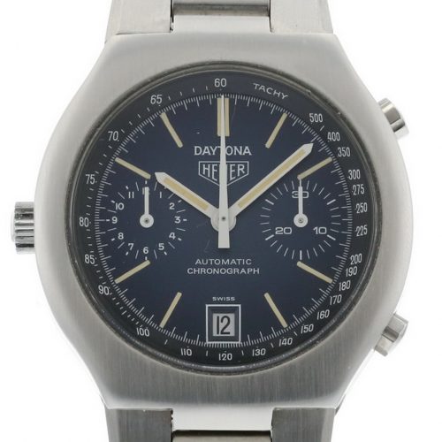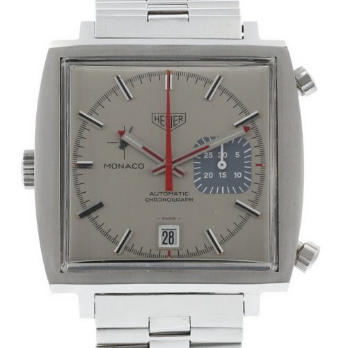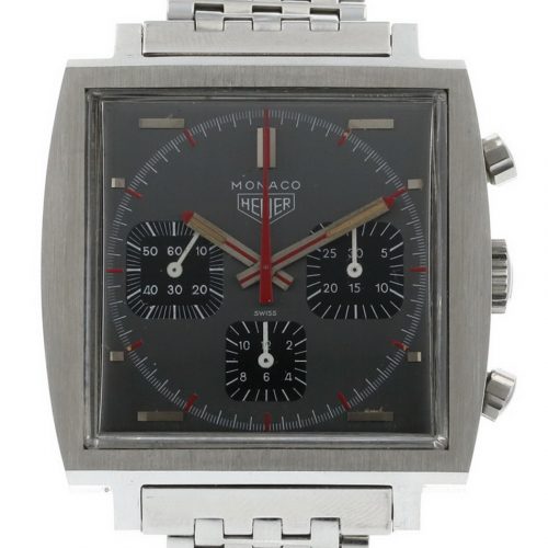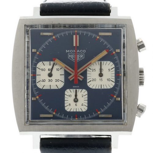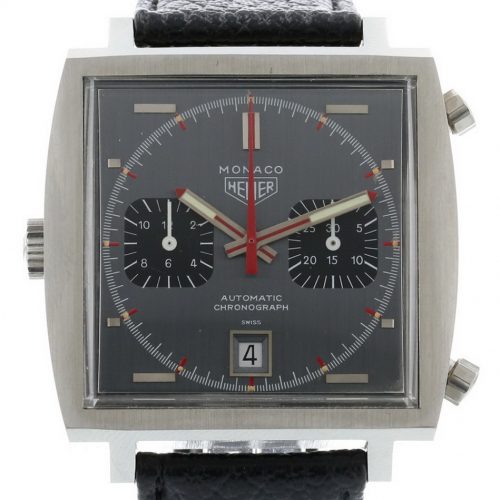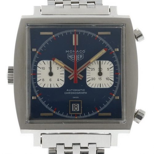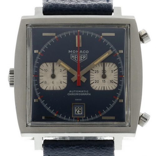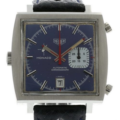 When Heuer introduced its line-up of automatic chronographs in 1969, two of the new automatic chronographs – the Autavia and the Carrera – were carried forward from existing models, although each received a new, larger case to house the automatic movement. The Monaco was the third member of the automatic line-up, but its design represented a radical departure from anything that Heuer had previously offered (or, for that matter, anything that any other brand had offered previously). The Monaco used a square, waterproof case, with the front piece of the case being held to the back of the case by internal clips. Over its life, the Monaco appeared with blue, silver, gray and black dials, powered by automatic and manual movements.