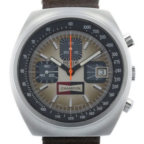 - Item 8 is a Reference 1614 chronograph, made for Heuer in France and powered by the Valjoux 7765 movement. This one has the fume (smoke) dial, with theChampion logo across the bottom. The inner tachymeter bezel completes the racing look of this model.
