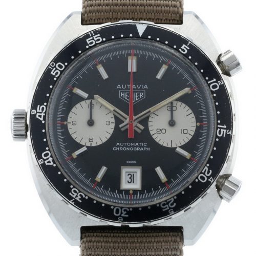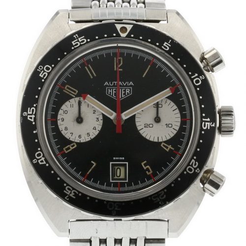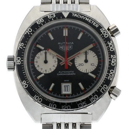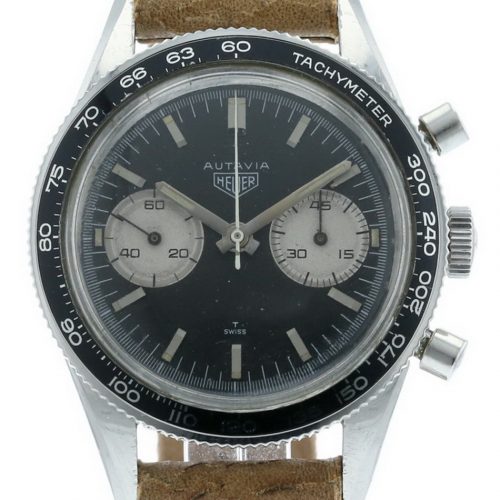 The word “Autavia” combines the words “AUTomobile” and “AVIAtion”, and Heuer had used Autavia as a model name for one of its dashboard timers, from the mid-1930s through the mid-1950s. Until the early 1960s, Heuer had used only reference numbers for its chronographs, but in 1962 Heuer decided to use the Autavia name for a line of its chronographs (so the Autavias became the first Heuer chronographs to have model names). The early Autavia chronographs have several defining features — cases are a traditional round shape, dials are black with contrasting white registers (subject to one exception, which we will describe below) and throughout their lives, all the Autavias had rotating bezels. Different inserts in the bezel would have markings for hours, minutes, a second time zone or the computation of speed by a tachymeter scale. As with all chronographs of the 1960s, movements are manual-winding, with a capacity of 30 or 45 minutes (for the two-register models) or 12 hours (for the three register models). All early Autavias are marked, ““Stainless Steel Chronograph – Waterproof – Guaranteed 330 Feet Under Water”.
