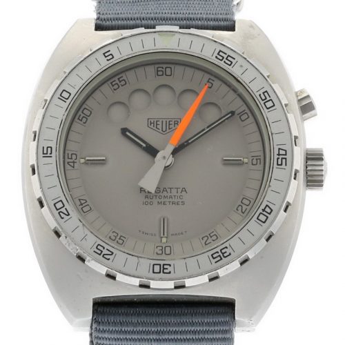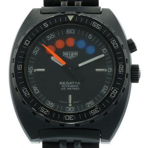 The Skippers use a conventional chronograph configuration to provide the countdown to the start of a regatta, but from the mid-1960s, Heuer had offered a very type of display ideally suited to time the five-minute intervals before the start of a yacht race. These “Regatta” models used a series of five “balls” across the top of the dial, that appeared to change colors every minute, to mark the countdown. The first two series of Regattas, introduced in the mid-1960s and 1970s, used conventional stainless steel cases. Around 1983, the Regatta took on an entirely new look, with the introduction of the 134.600 Series. This new version of the Regatta borrowed its case from the last and largest of the Autavias (Reference 11063), that was waterproof to 100 meters, with a mineral crystal. The dials are gray, black or military green, with matching cases, bezels, crowns and pushers.