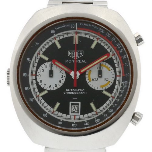 Just in case Heuer hadn’t gone far enough with the design of the Monaco, in 1972 Heuer introduced the Montreal, another Caliber 12 powered chronograph that made the Monaco seem almost tame. The Montreal was a lump of steel, with a starburst brushed finish on the top surface and polished steel side surfaces. The inner bezel has both Tachymeter and Pulsometer scales – in different colors, of course – with a contrasting track separating the dial from this inner bezel. The “Montreal” name captured the futuristic spirit of the World’s Fair, held there in 1968.