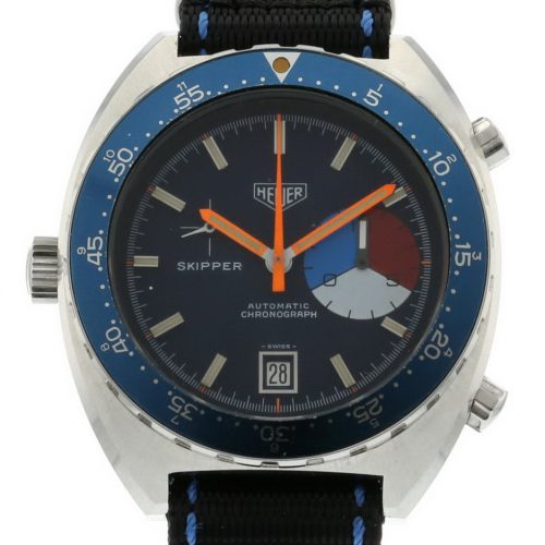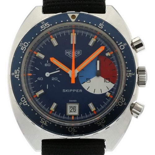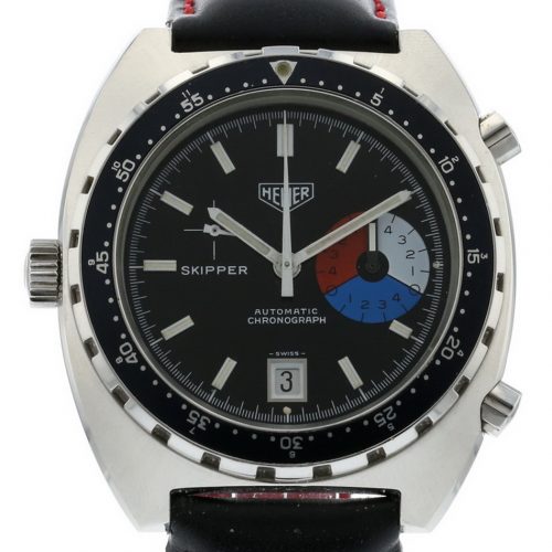 The Skipper was a chronograph designed by Heuer to allow yachtsmen to time the start of a race. Special gearing modified the chronograph minute recorder so that it indicated a 15-minute countdown to the start of the regatta, rather than the standard 30 minutes. Three five-minute segments, marked in red, white and blue, corresponded to the three horns sounded by race officials, to prepare for the start of the race. The first Skipper, introduced in the mid-1960s, was housed in a Carrera case, but the Skipper soon made the move to the Autavia case, which offered improved waterproofing for action on the water.