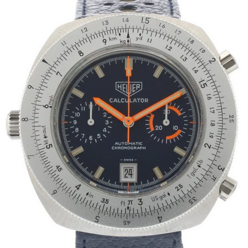 - Item 22 is Heuer’s unique Calculator chronograph. At 45 millimeters, this was Heuer’s largest chronograph – it looks big and it wears big. Theexternal bezel is split, with the inner piece remaining fixed in place while the outside part is rotated to perform calculations.