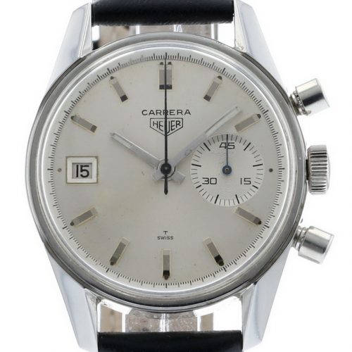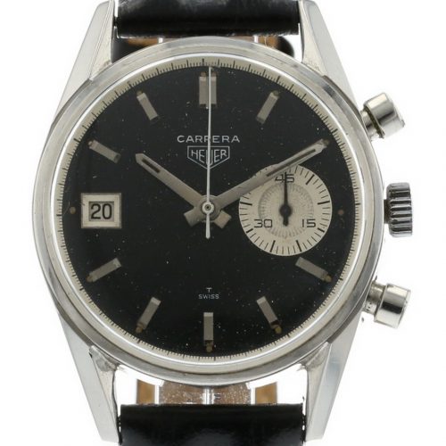 Heuer introduced the Carrera in 1963, and the early models are praised for their clean lines, evoking the essence of a chronograph designed for motorsports. The cases are a traditional round shape, and the lugs have a unique geometry not used on any other chronographs. Dials are clean, with the deletion of tachymeter and telemeter scales that cluttered many chronographs from the 1950s. Two versions of the Carrera offer calendars, the Carrera 45 Dato incorporates a date window into a chronograph with 45-minute capacity and the Carrera 12 Dato displays the day, date and month, with a full three register chronograph (12-hour capacity).