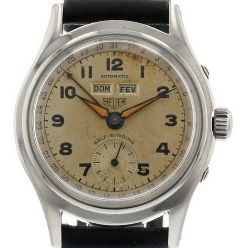 - In the 1950s, in addition to its chronographs, Heuer offered a full line of watches, with various complications – for example, watches with alarms or power reserve indicators. Item 29 is an automatic triple-calendar watch from the 1950s (Reference 1806), with a sub-dial for the running seconds.