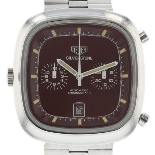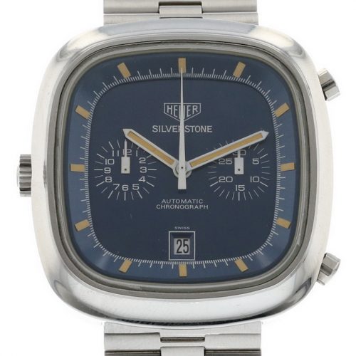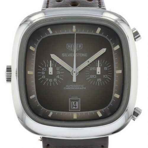 The Monaco was probably Heuer’s most radical chronograph, perhaps the brand’s ultimate example of the round peg placed in the square hole. The edges were razor sharp and the case used a novel construction, with the front of the case and the case-back being held together with interior spring clips. Launched in 1974, the Silverstone may have represented Heuer’s attempt to soften the Monaco, with the corners being rounded and the case utilizing a more traditional screw-back construction. There were three of these Caliber 12 powered Silverstones, with the only differences being the color of the dial and the inner flange. A later version of the Silverstone would have a black dial and be powered by the Lemania 5100 movement.